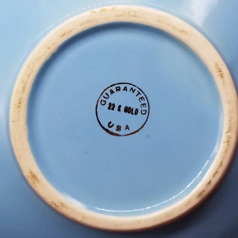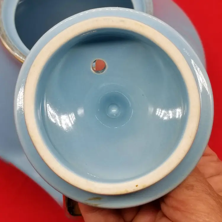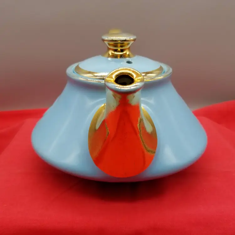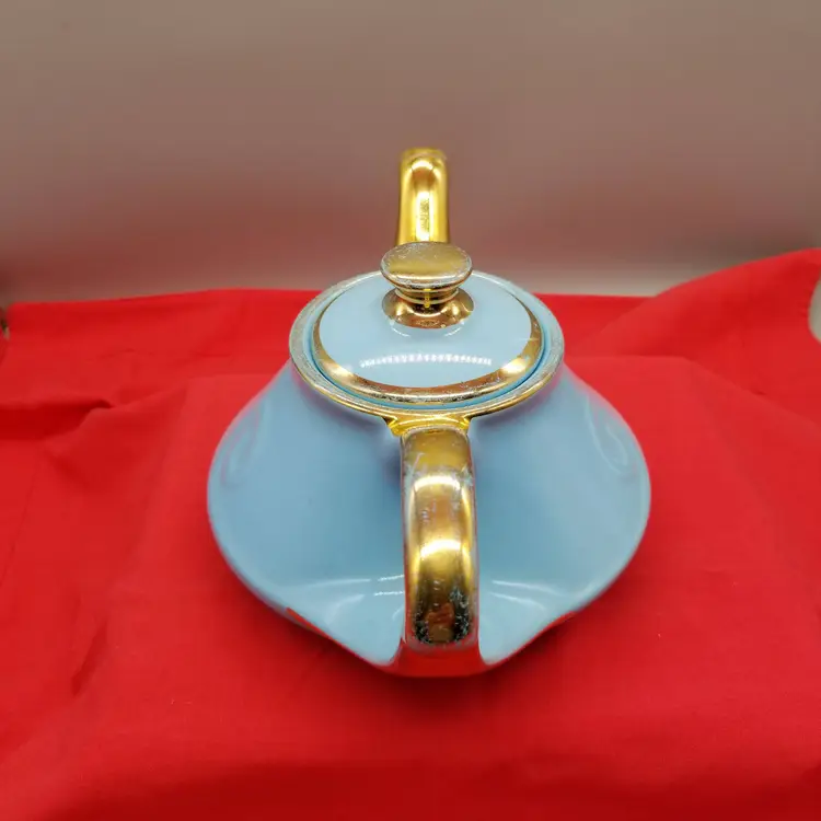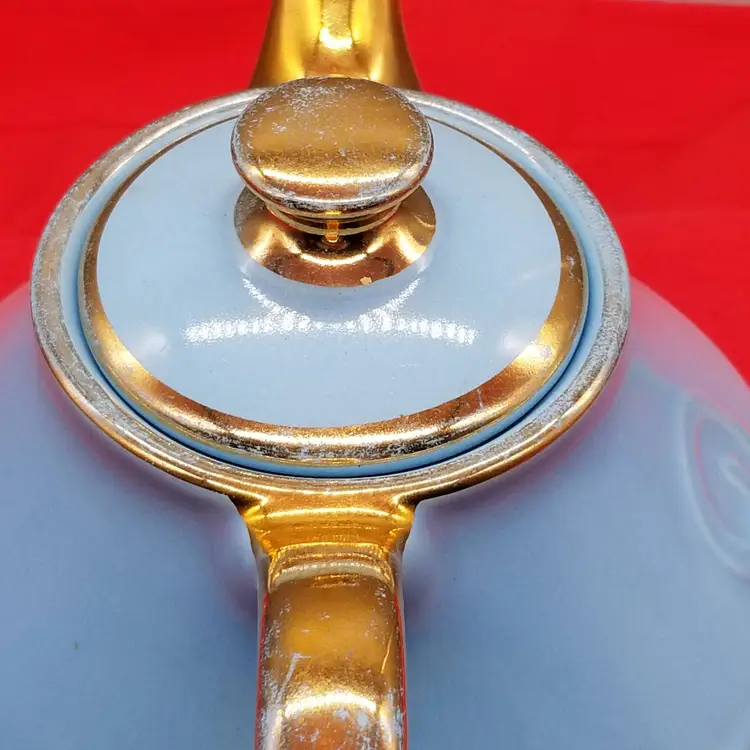 Vintage Pearl China 22 KT Gold Decorated Teapot is 5" tall. It is a light blue color with a swirl embossed in the sides. It is decorated with gold trim that shows quite a bit of wear on the handle, top and tip of spout. It is in good condition with no chips, cracks or repairs.