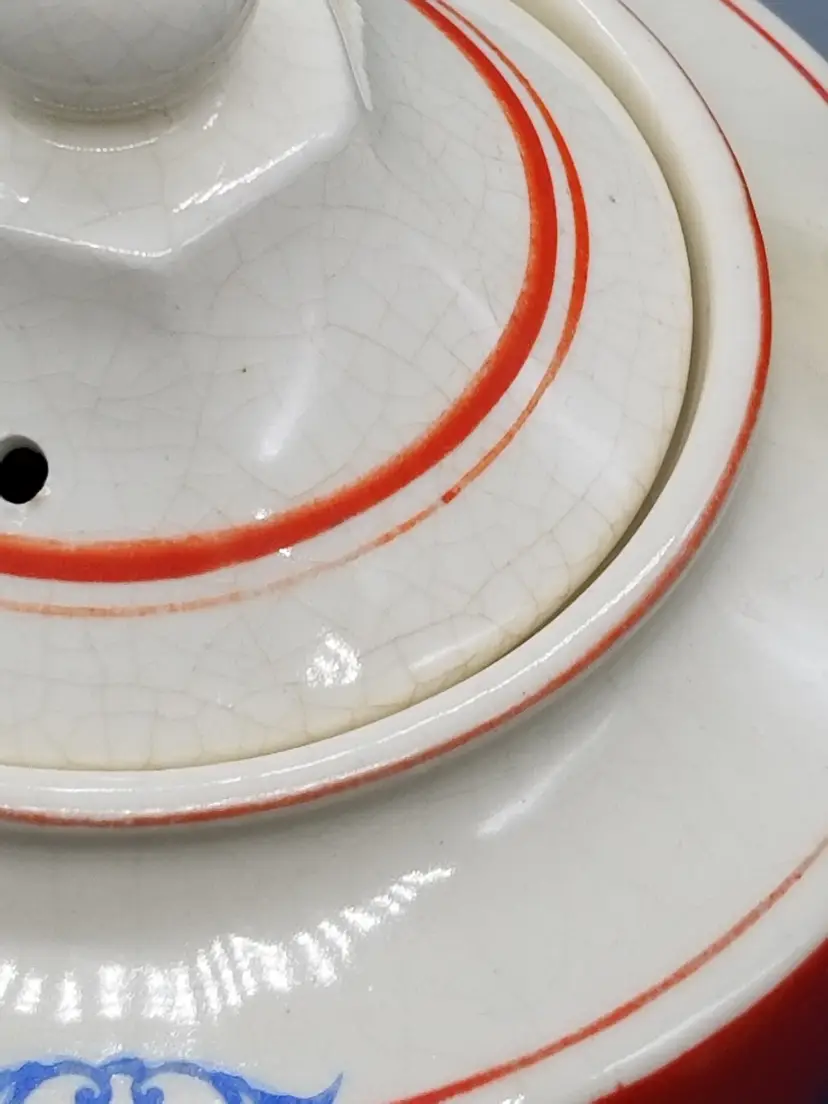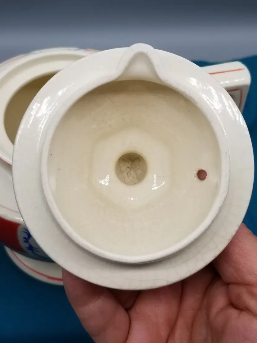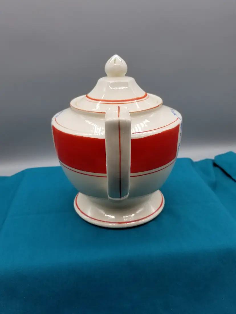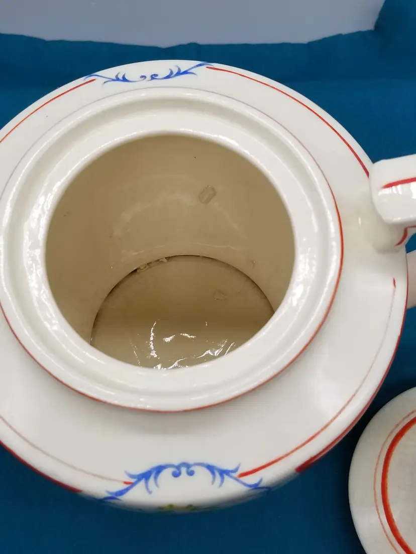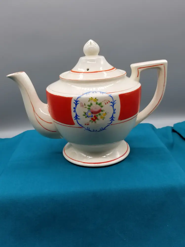 Vintage Pottery Decorated Teapot is 7" tall. It is an ivory color with a red band and decorated with flowers and red trim that shows quite a bit of wear on the handle, top and tip of spout. It has crazing all over with a little staining. It is in good condition with no chips, cracks or repairs.