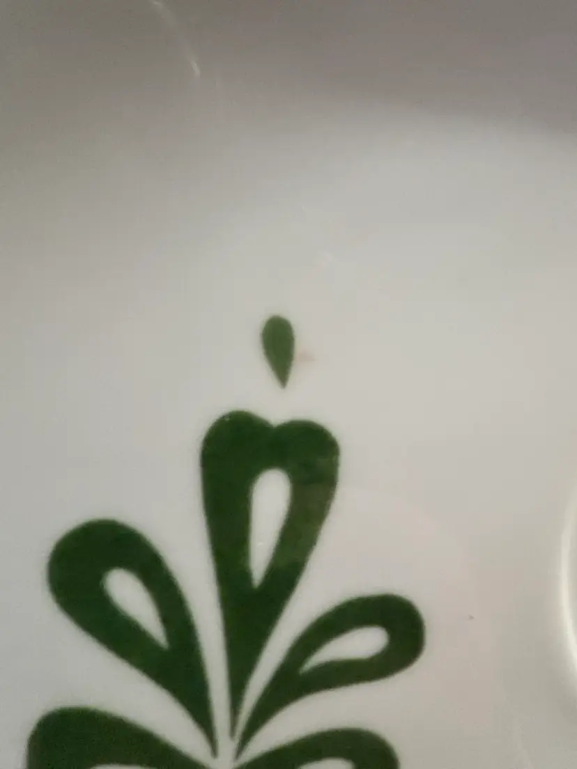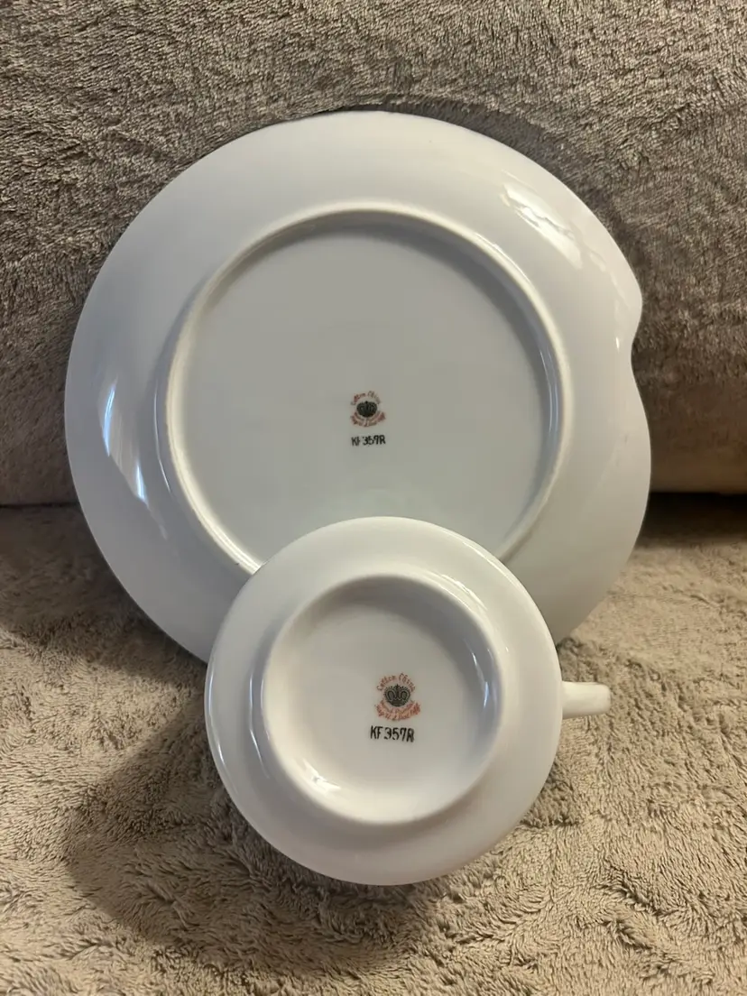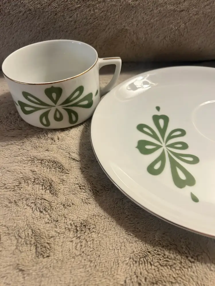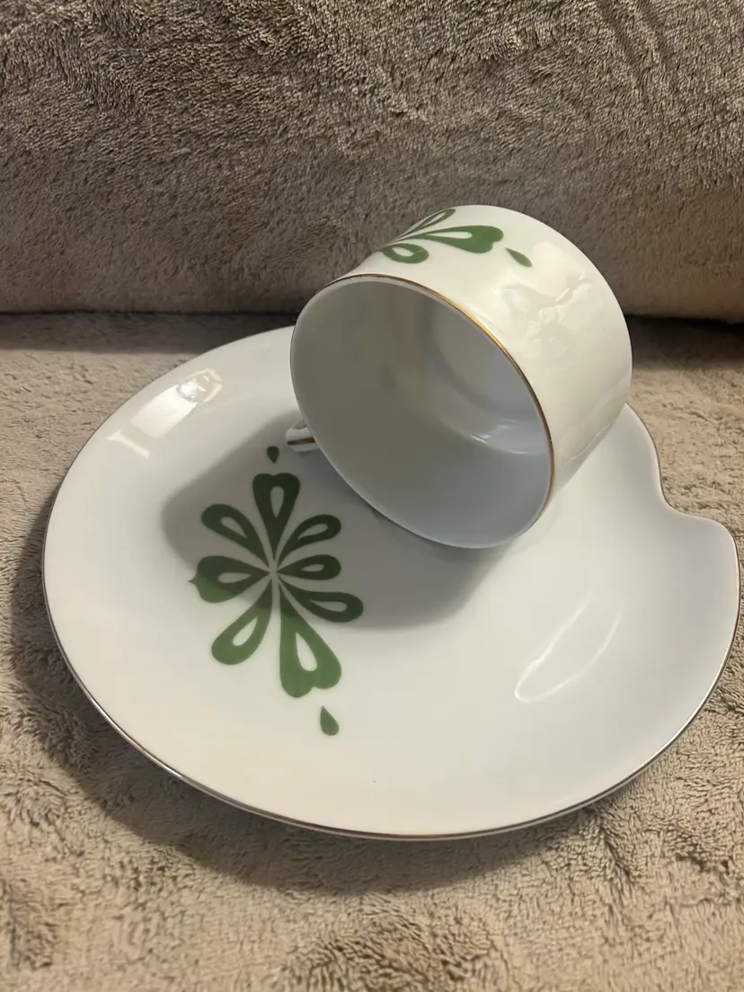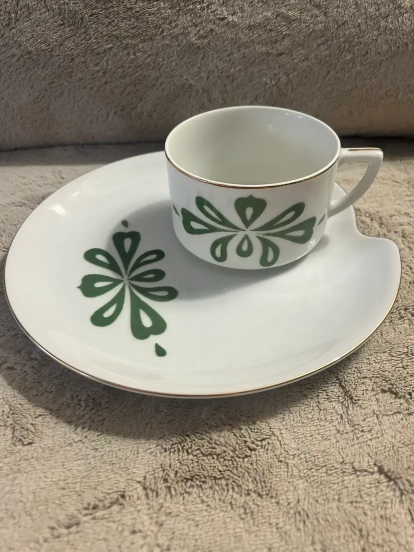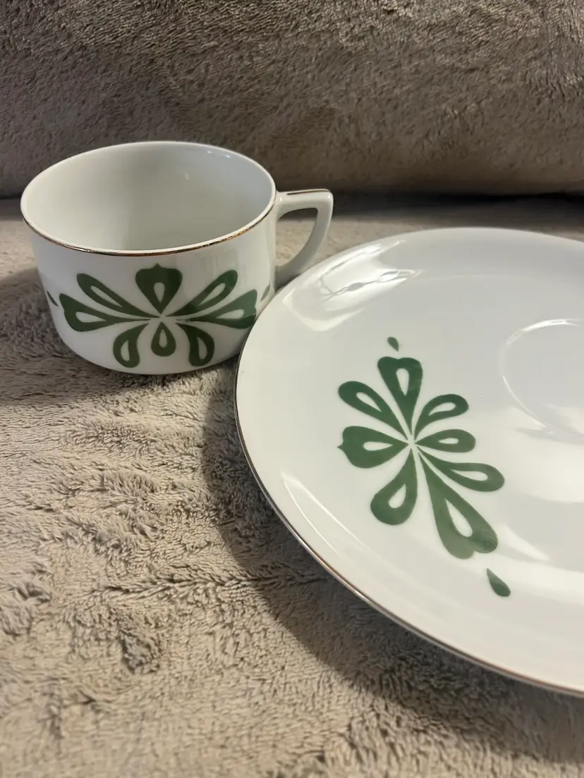 This is a vintage MCM (Mid-Century Modern) Lefton's China cup and snack plate set, marked Japan. The set is made of white porcelain with a green floral pattern and gold-tone rims. They are hand painted. One set is slightly lighter green and one plate has a tiny blemish as shown in the last picture. Gold trim on all pieces is still nice given the age.