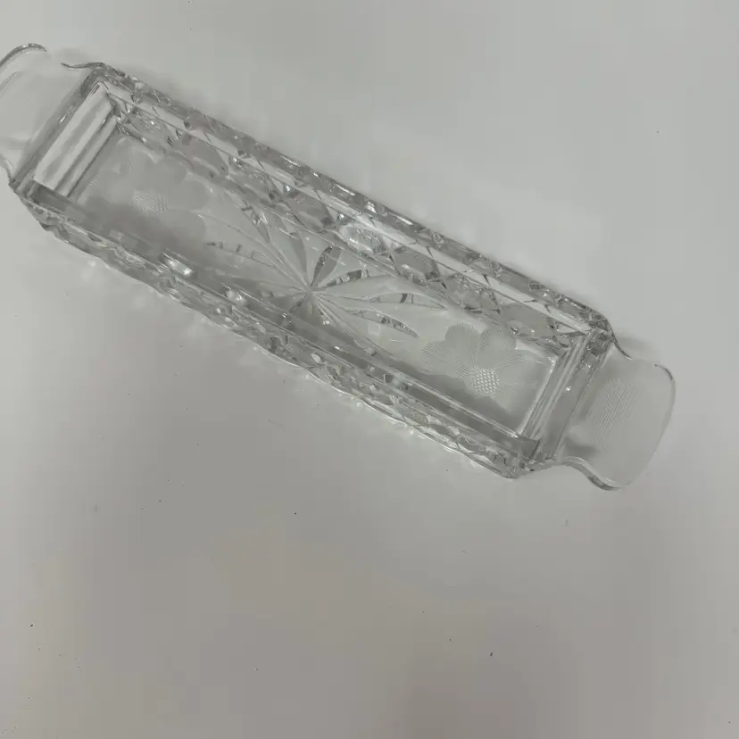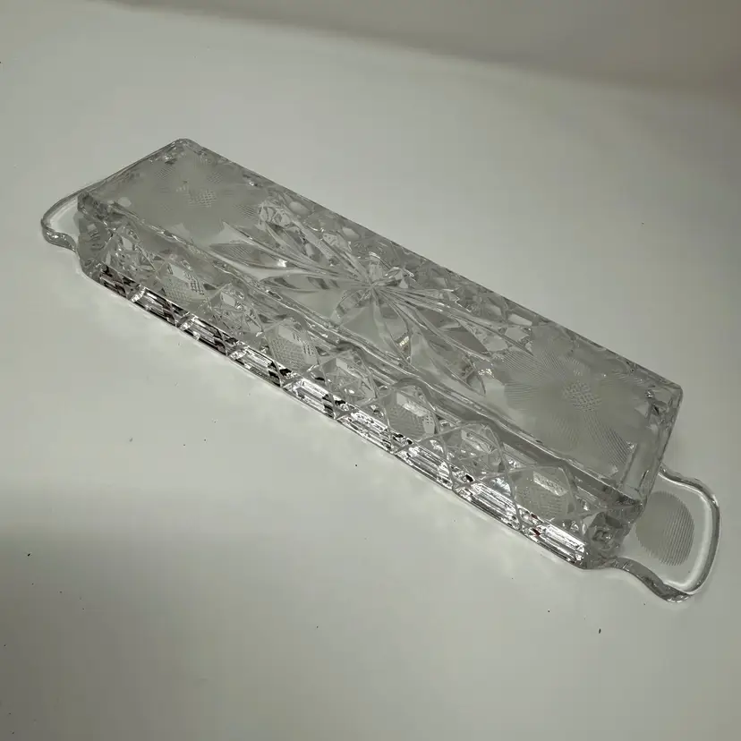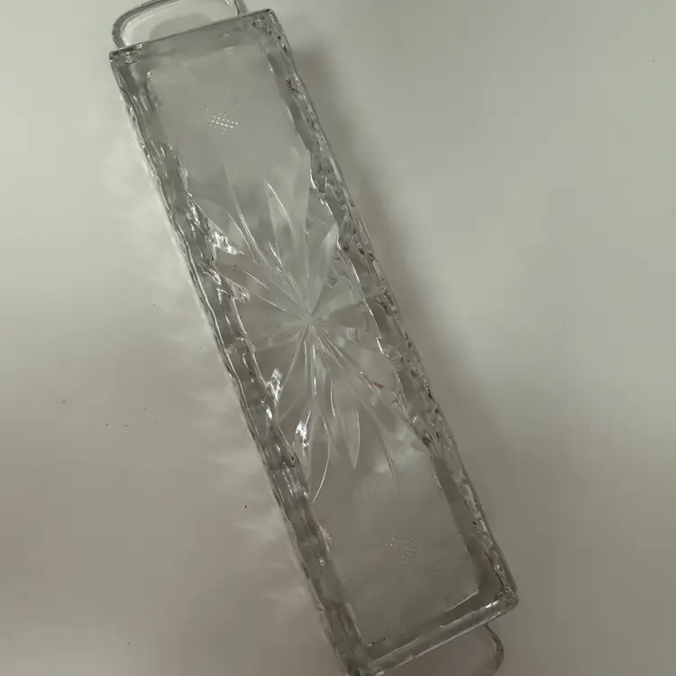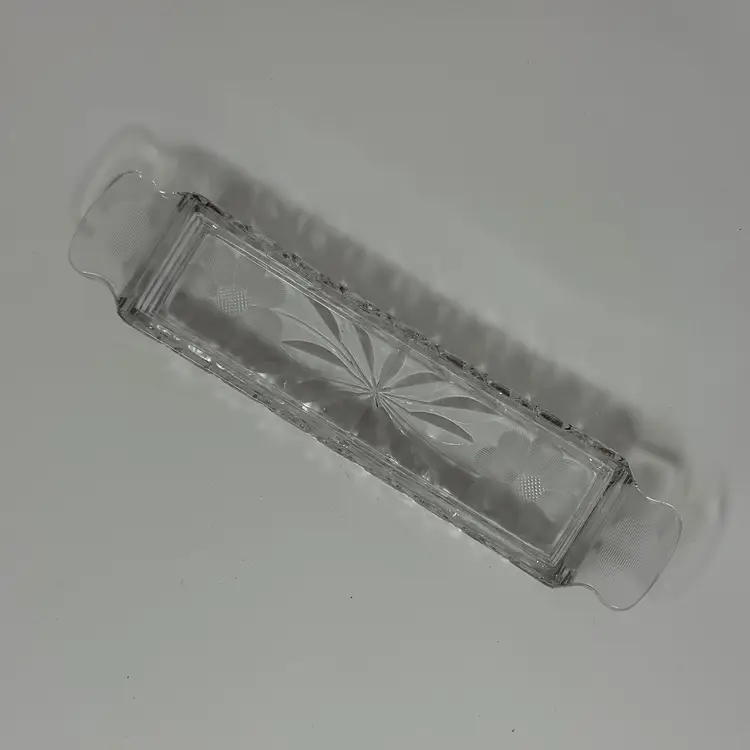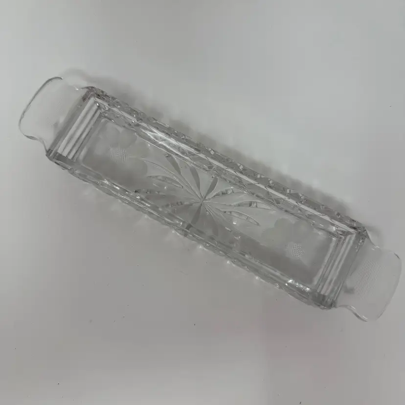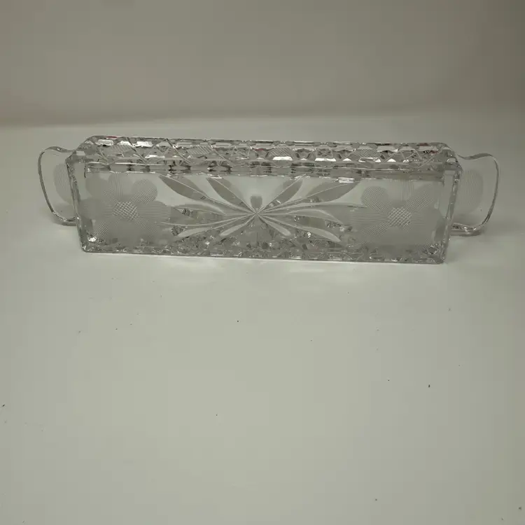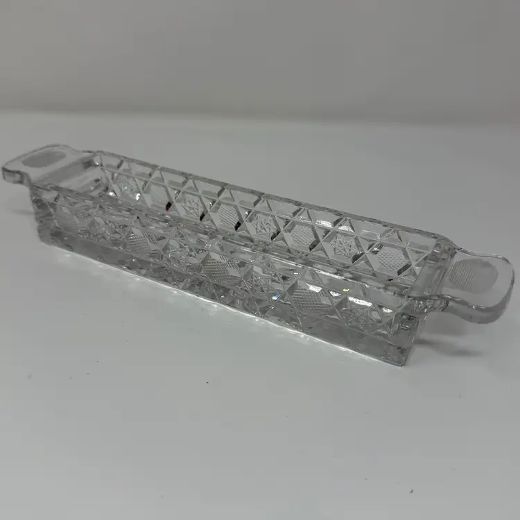 Long rectangular shape with handles on 2 ends. Perfect for holding relish, olives, cracker, sugar cubes. Fine details overall. 1 tiny ding on rim. 9" x 2" x 1.75"