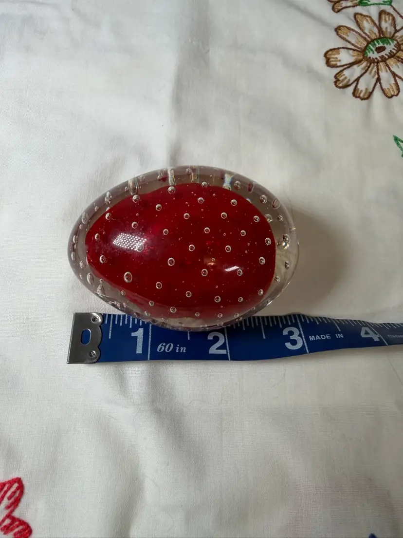 Details: • Item: Art glass paperweight • Color: Deep ruby red with clear glass overlay • Design: Controlled bubble pattern • Shape: Oval • Approximate size: 4 inches long (see measuring photo) • Original foil label remains attached on underside