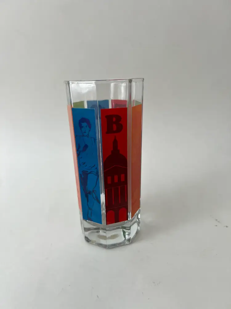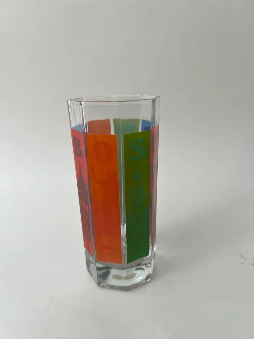 Vintage octagon shaped Boston drinking glass. Rainbow colored sides feature Boston landmarks Great vintage condition 5.5" tall