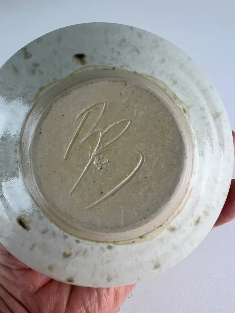 Signed RB, as shown. I do not detect any post-studio damage such as chips, cracks, hairlines or repairs. The bottom was sealed by the artist. This has a beautiful feathery glaze. This will be shipped to its new home via the "double box" process. This would look fantastic in a Mid Century Modern decor with its beautiful design and execution.