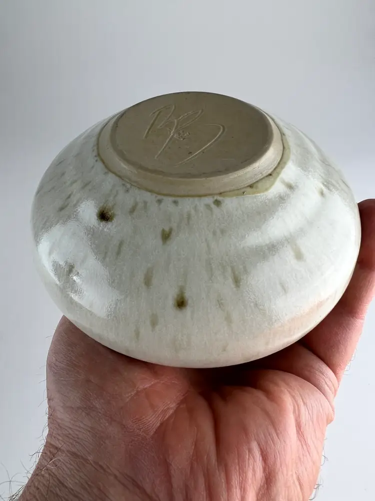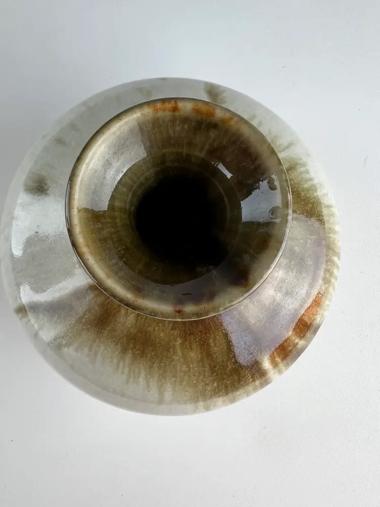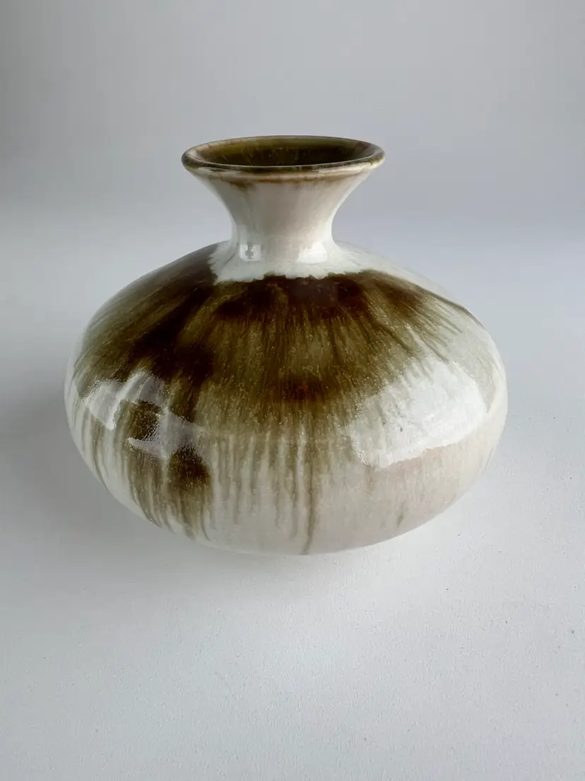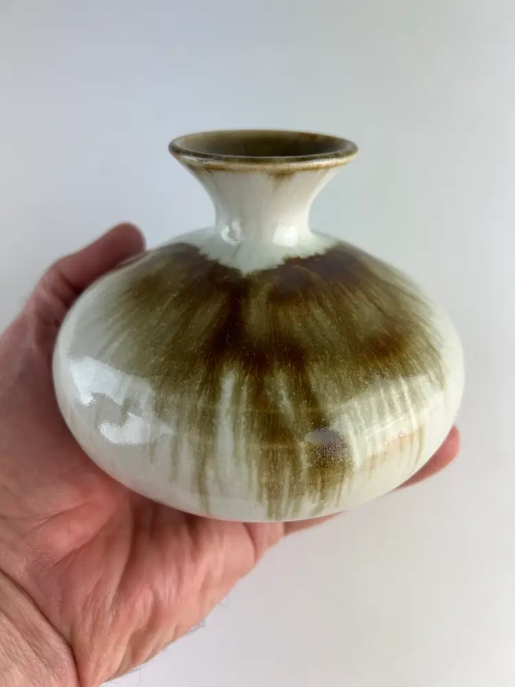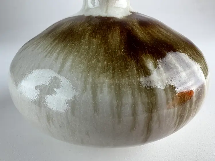 The Charlie B Gallery of Carson City, Nevada is offering this Roger Butler(1952-2020) pottery form. This form as many found on the internet were an oil candle which utilized a holed pottery bead threaded with a wick. Many of these forms have become vase forms or weedpots over the years as this one I am offering here. Roger founded the Feather River Pottery in 1977. He was last working in Westwood, California under the business name of Fire In The Sky Pottery. It was well known that these oil candles were marketed all over the United States through the National Parks thus you find them everywhere. I was told by a former gallery owner that represented Roger Butler he passed away in 2020.