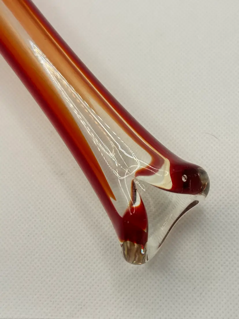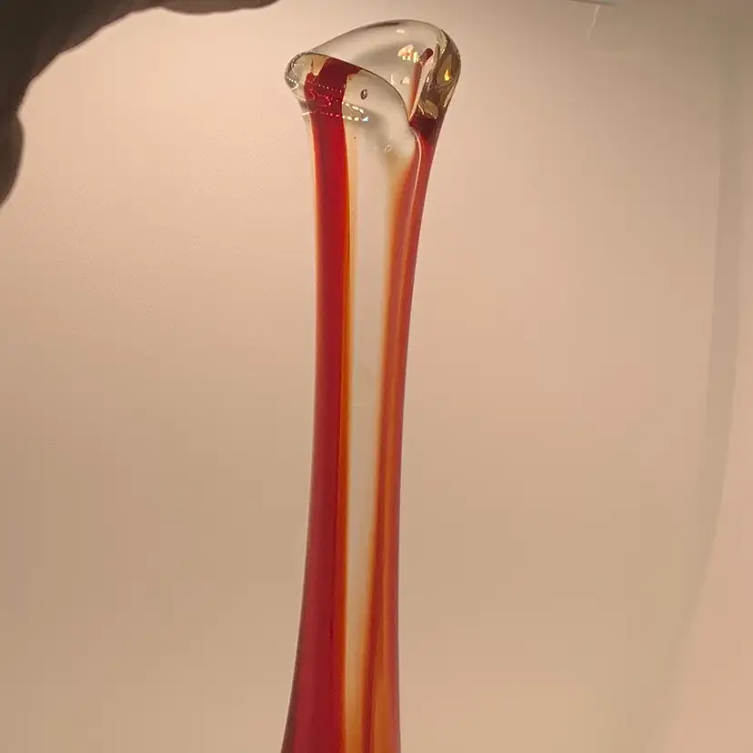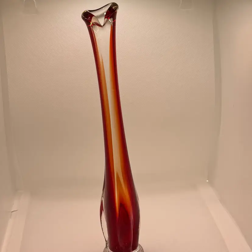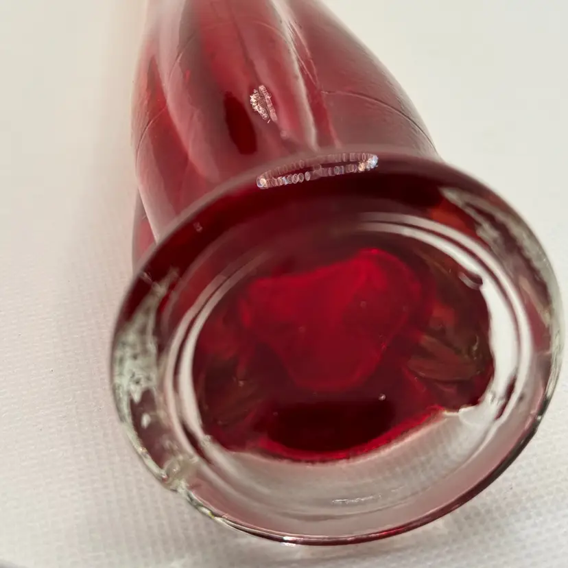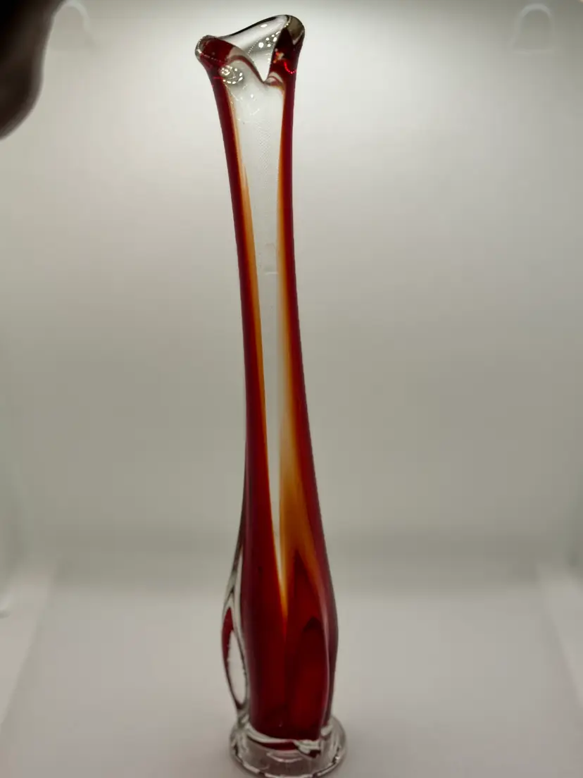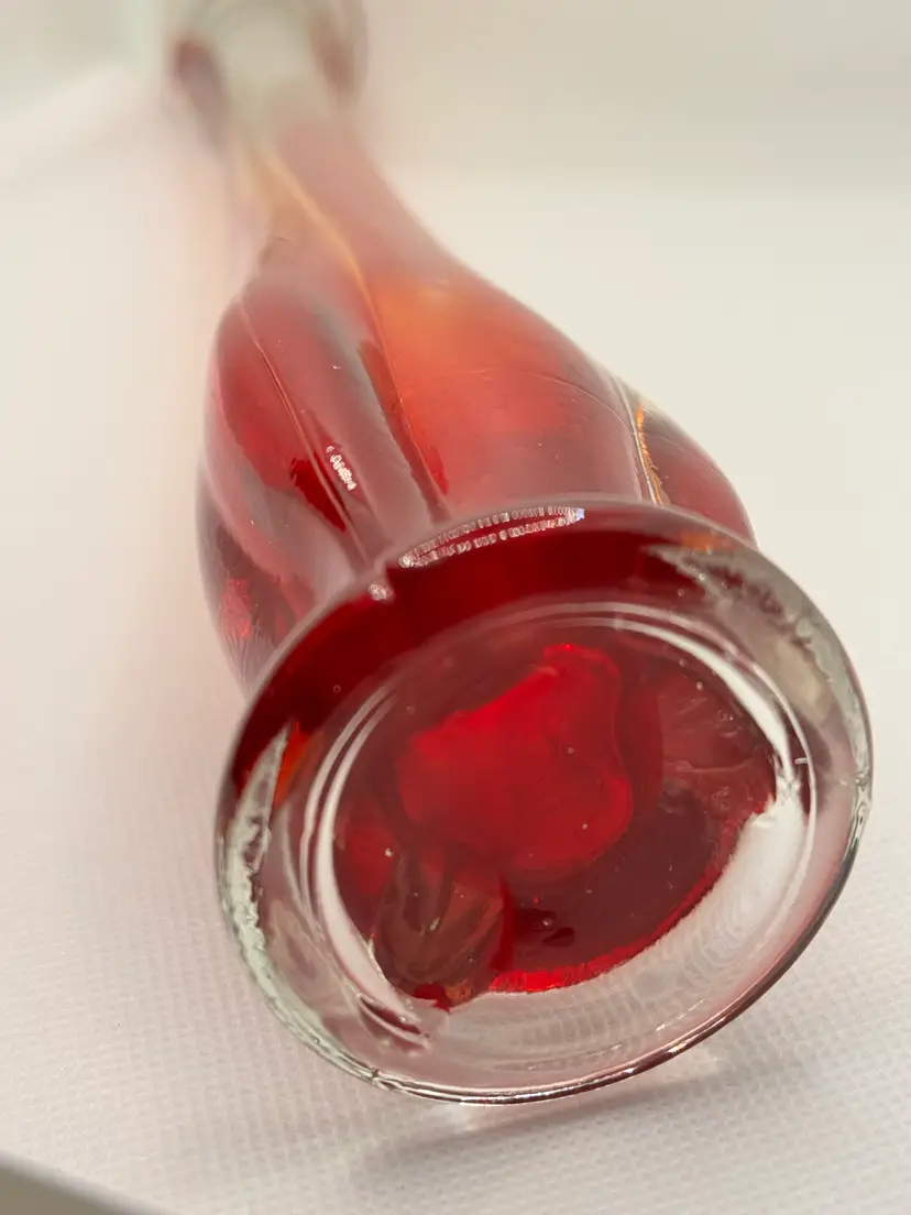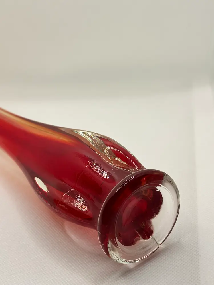 Vintage ruby red & clear glass handblown swung vase. Very beautiful, perfect for any occasion. No chips or cracks. Measures 2.25x12x2, opening 1”. Weighs 1lb.
