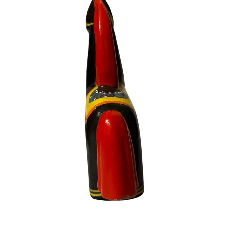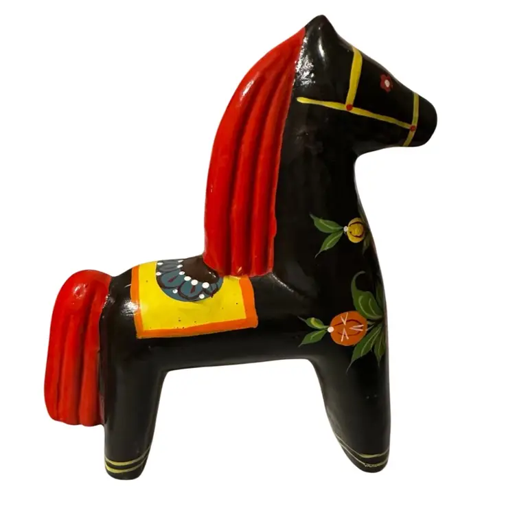 Features traditional hand-painted floral designs and colors similar to a Swedish Dala horse. These were often produced around the 1970s or 1980s. 8 inches tall and 6 inches wide