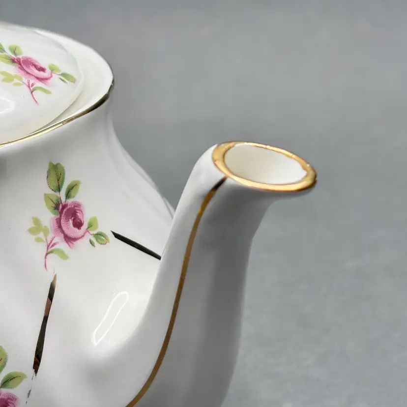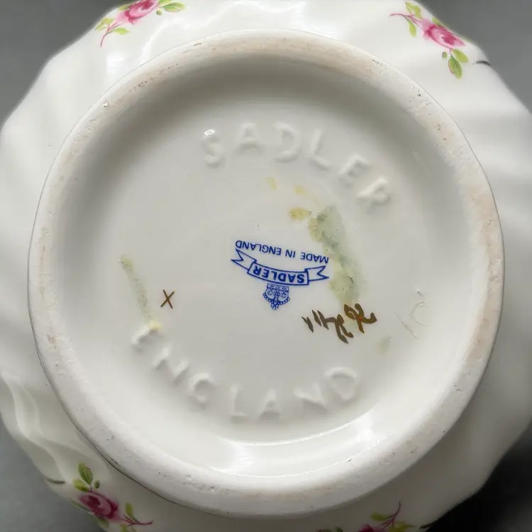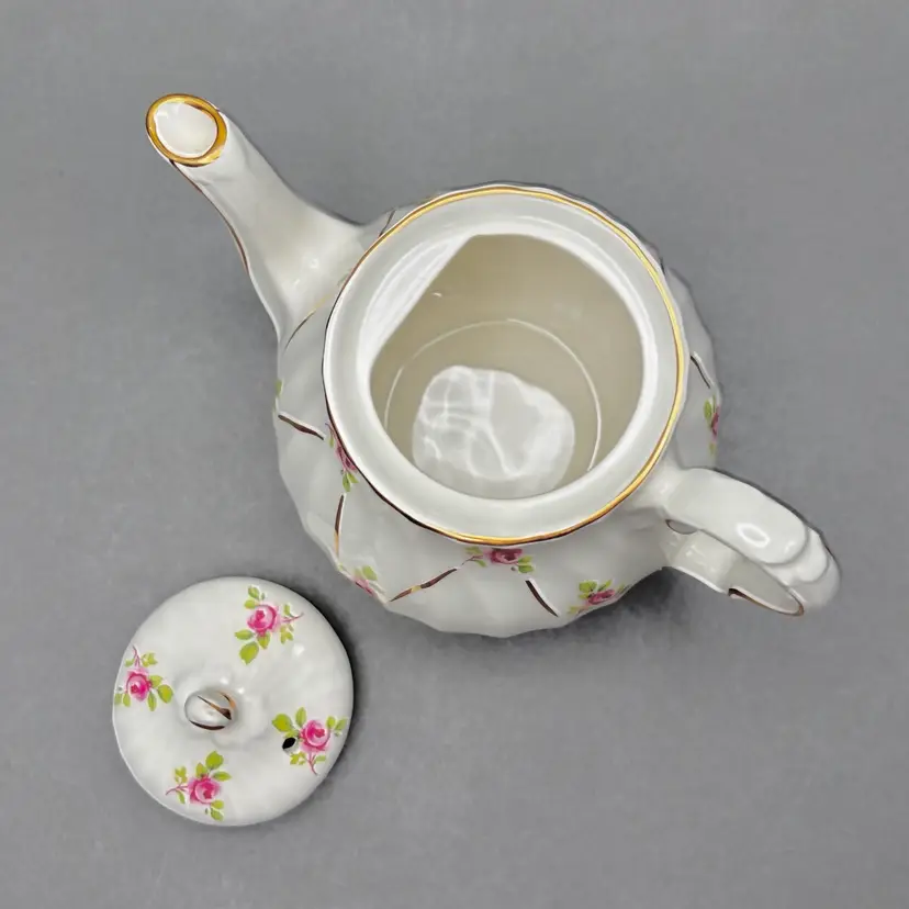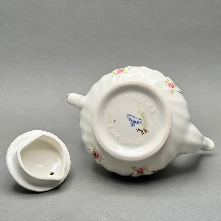 • This charming small vintage teapot by Sadler England features a classic white swirl body adorned with delicate pink roses and elegant gold gilt lattice detailing. It is a lovely "tea for one" size, marked with the Sadler banner and pattern number 1682 on the base.