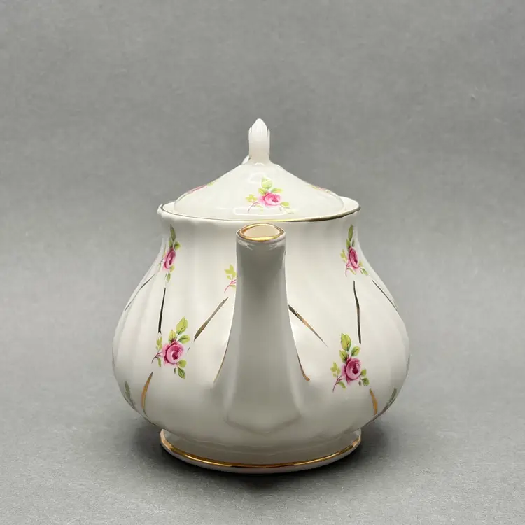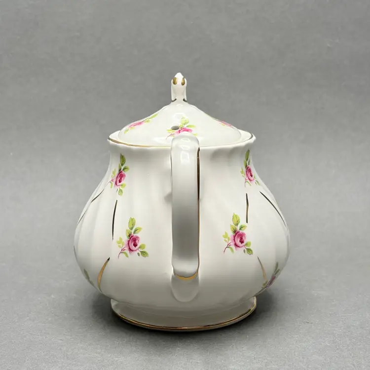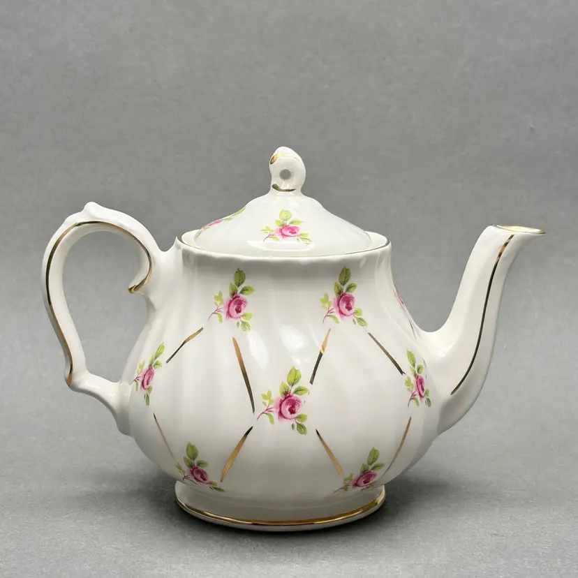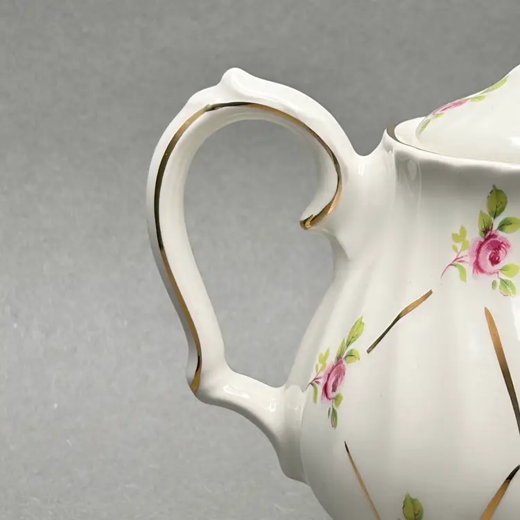 Vintage Sadler England White Swirl Fluted Teapot with Pink Roses and Gold Gilt