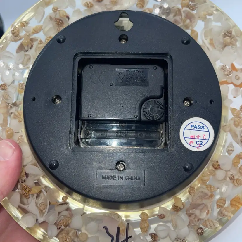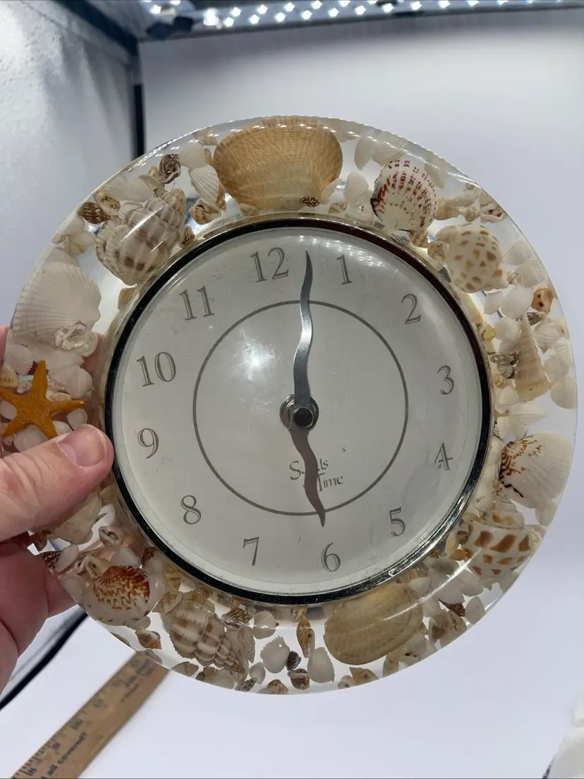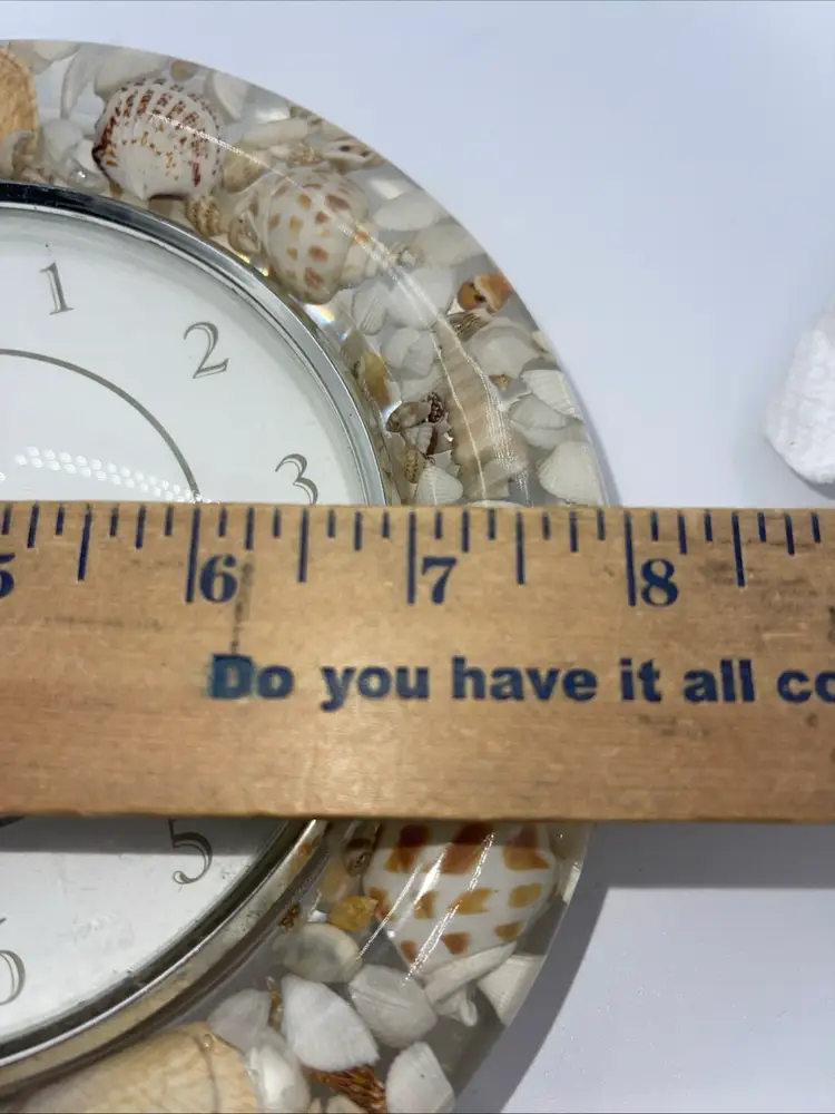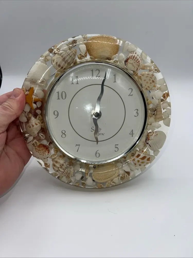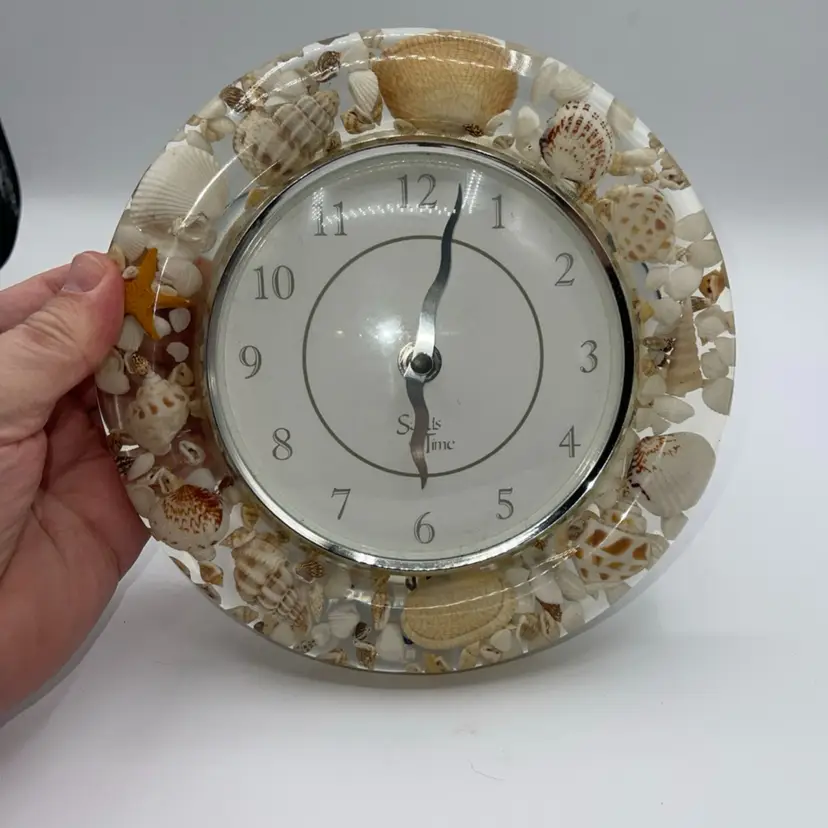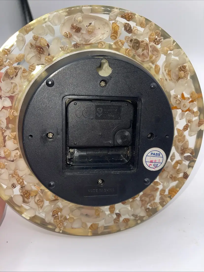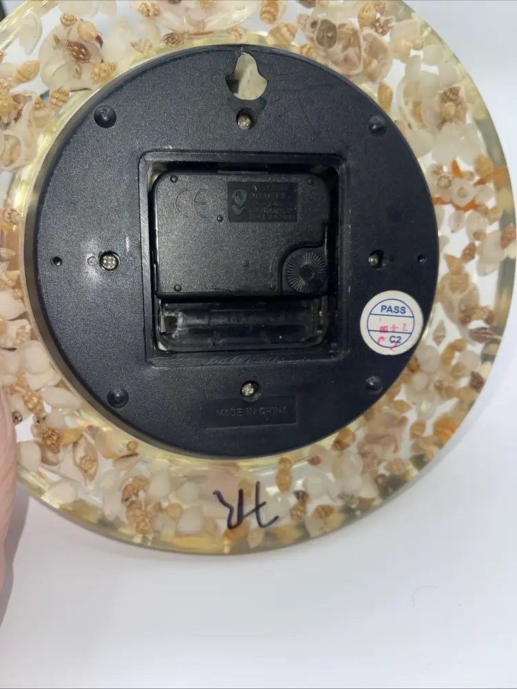 This is a beautiful clock. It’s Sands of time. It has loose sight with shells starfish all the way around it’s 8 inches across. It does take one AA battery not included. Thank you for looking and asking any questions you may have.