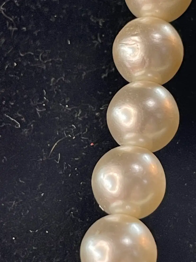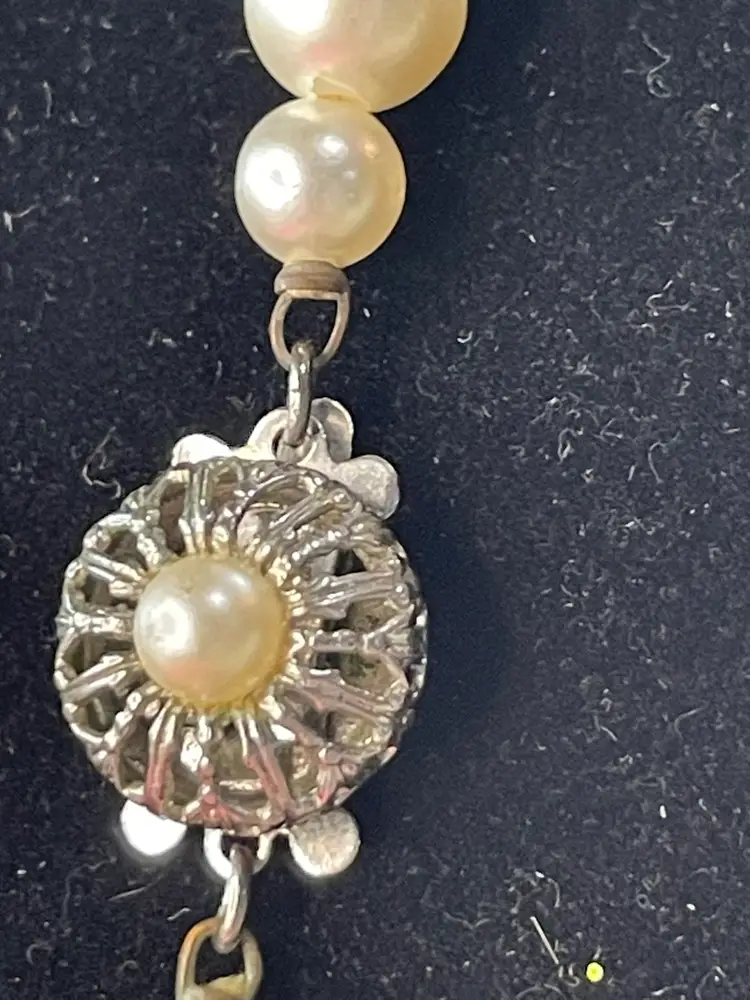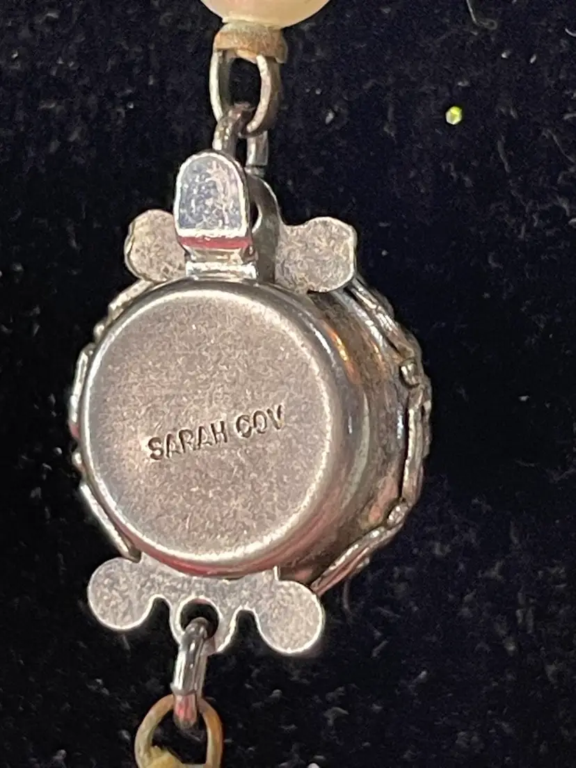 This is a vintage Sarah Coventry faux pearl necklace from around the 1970s. The white thread has stretched so check out the photos near the clasp. This may be worn as is or re-strung. The faux pearls are 8mm and the length of the necklace is about 24 inches.