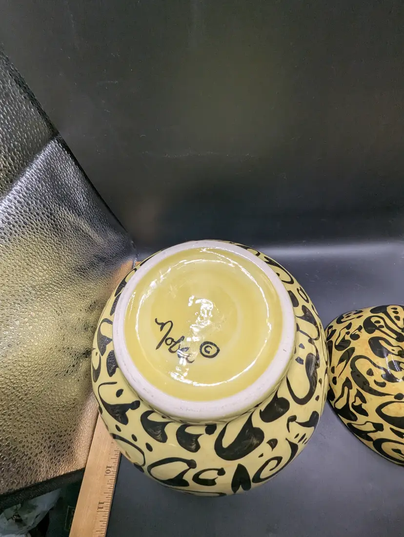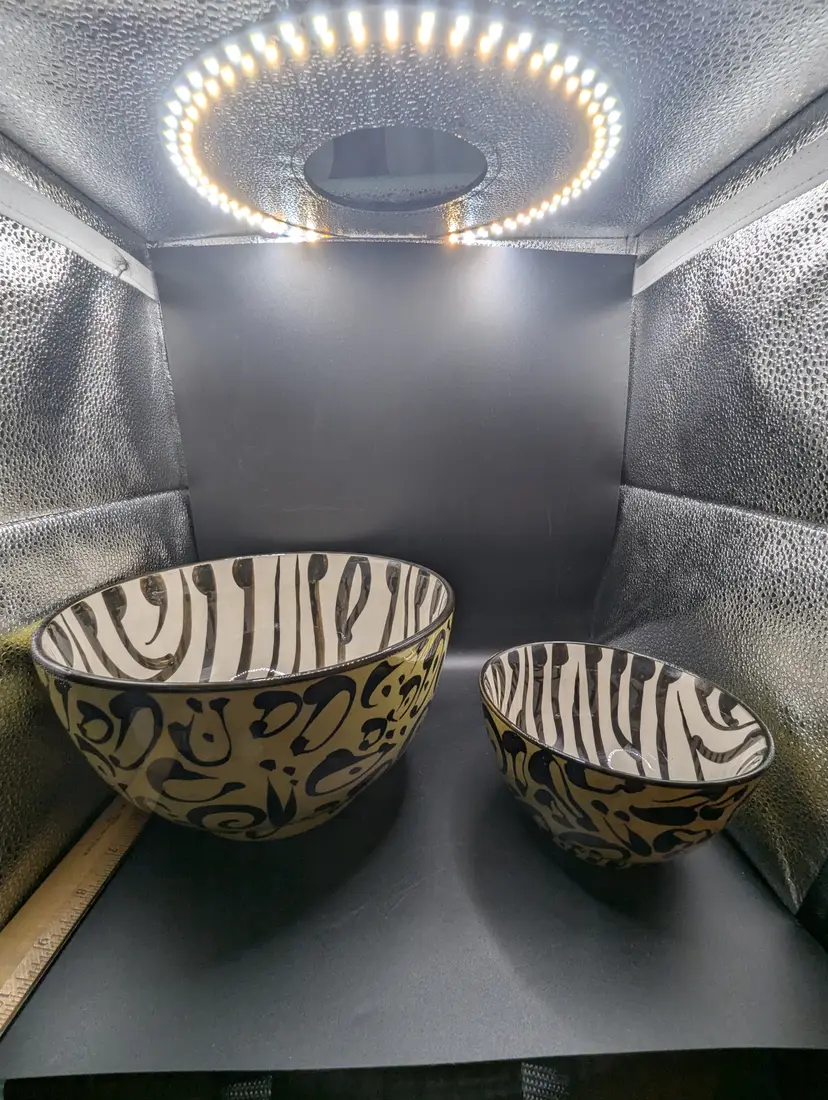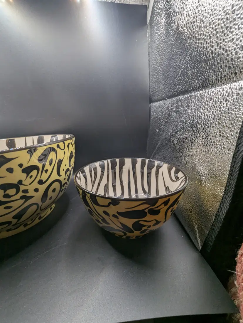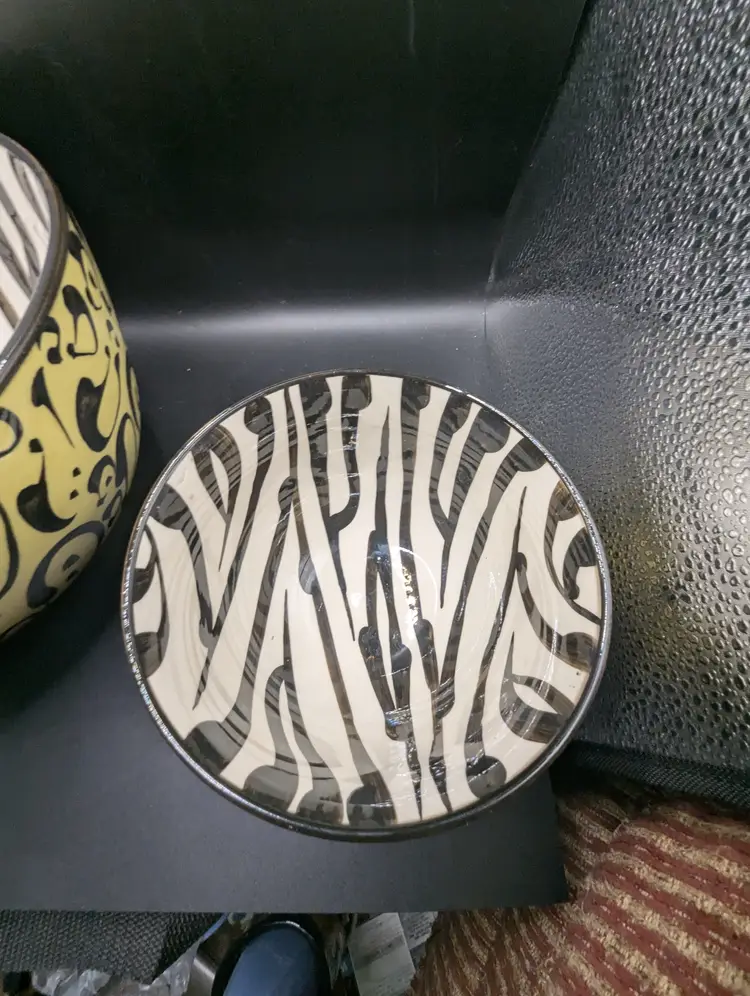 This is a lovely Vintage Set of 2 Evandale Porcelain Handpainted Tan/White/Black Stripe Mixing Bowls Signed Noble. No chips or cracks. Please see all pictures for condition and measurements.