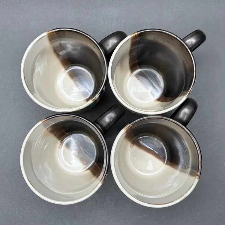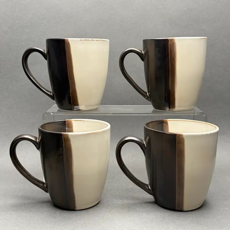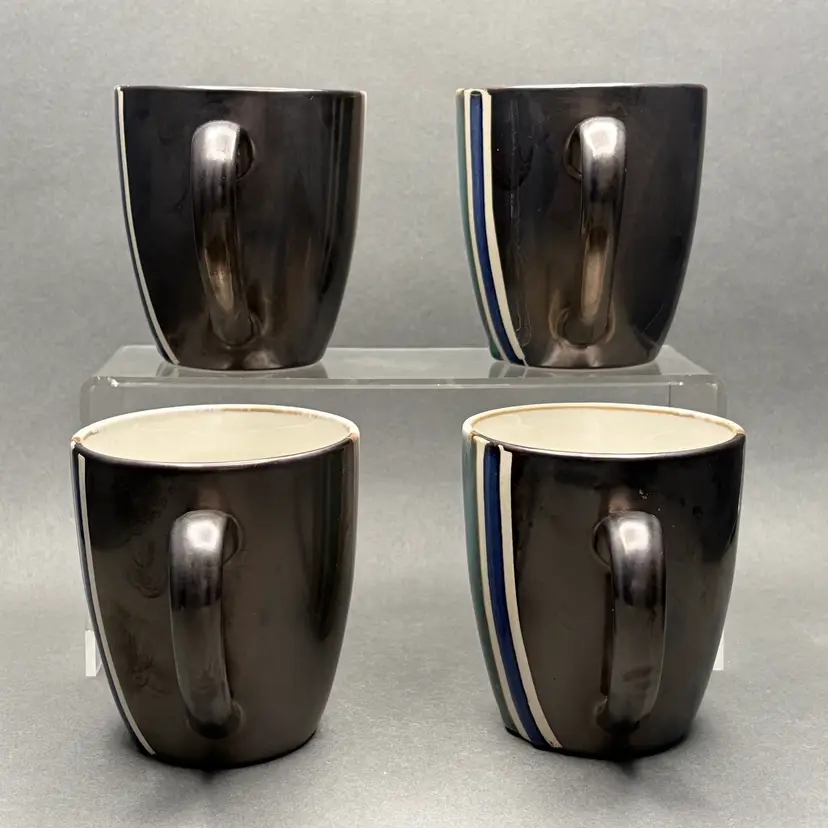 This set of four American Atelier stoneware mugs features a modern vertical stripe pattern in blue, cream, and brown, distinguished by a unique iridescent glaze on the brown bands that shimmers in the light. The earthy color palette and metallic finish make them a striking addition to any contemporary or rustic kitchen.