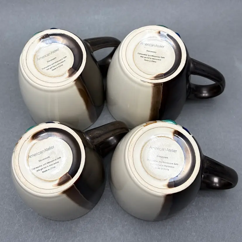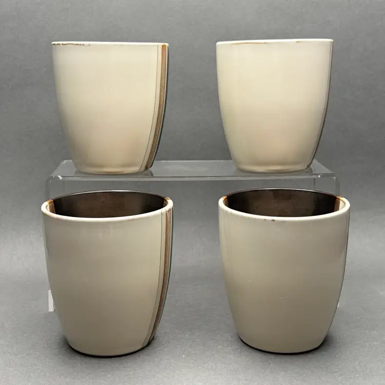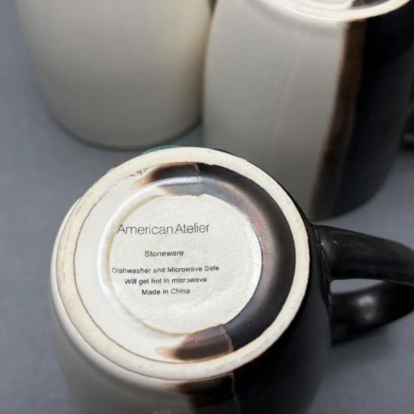 • Brand: American Atelier • Material: Stoneware • Pattern: Vertical Striped / Iridescent Brown Glaze • Capacity: 12 Fluid Ounces • Measurements: 3 1/2” body diameter x 4” tall • Condition: It is in very good vintage condition with no visible chips, cracks or scratches.