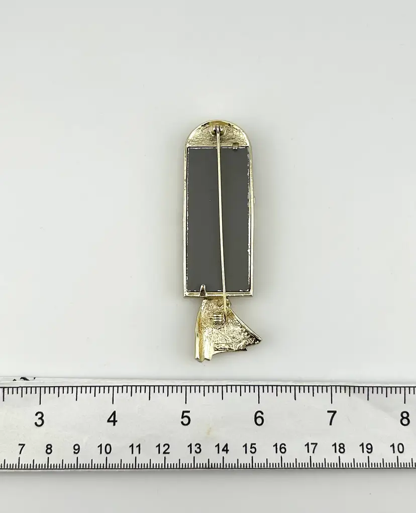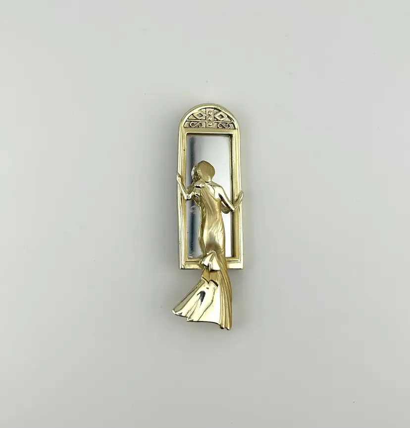 Vintage Signed AJC Gold Tone Lady In Mirror Brooch 3.5”x 1”