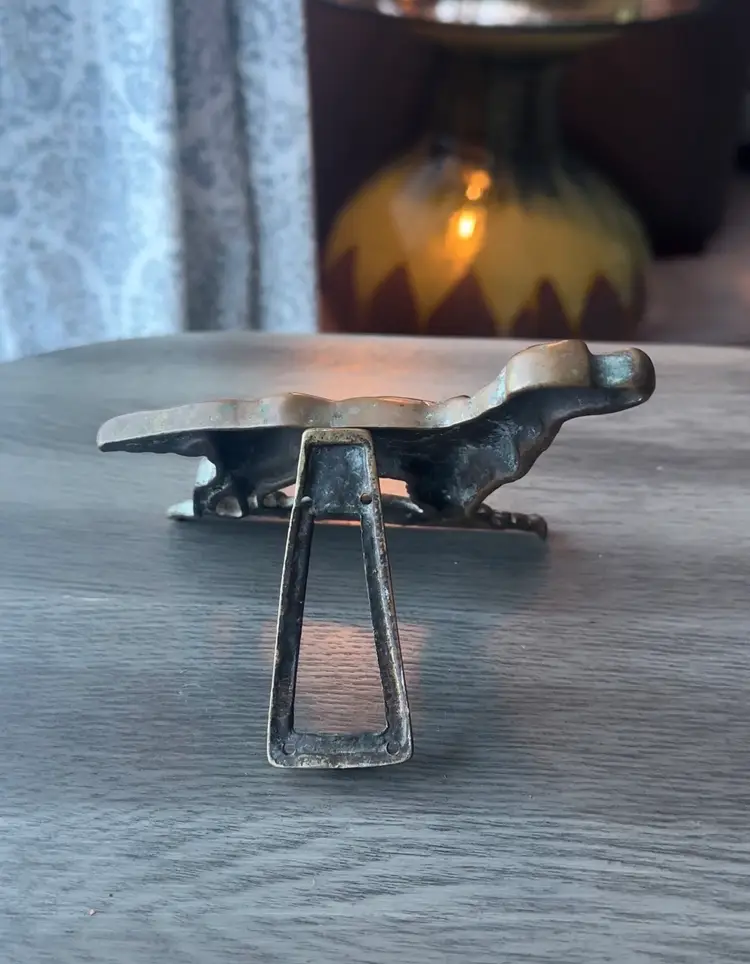 This vintage solid brass English Setter dog free-standing figurine is a charming collectible piece from the late 20th century. Crafted with attention to detail, this small figurine features a unique English style design that will add character to any room. Made of brass, this figurine is perfect for animal lovers and collectors alike, and it is suitable for all occasions. Measures 5”w x 4.5”h. Please note that the piece is a bit tarnished.
