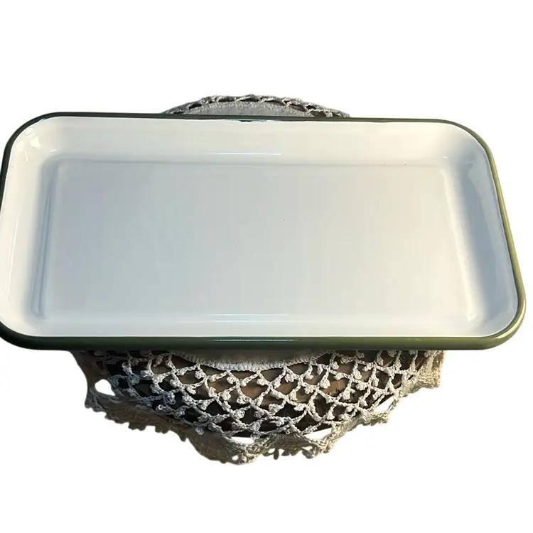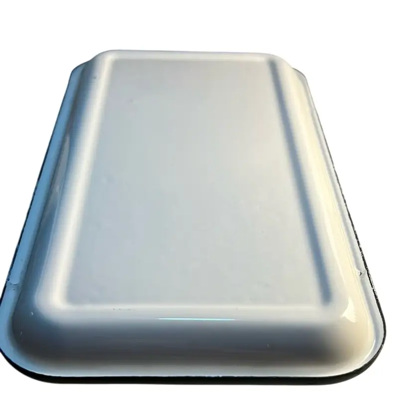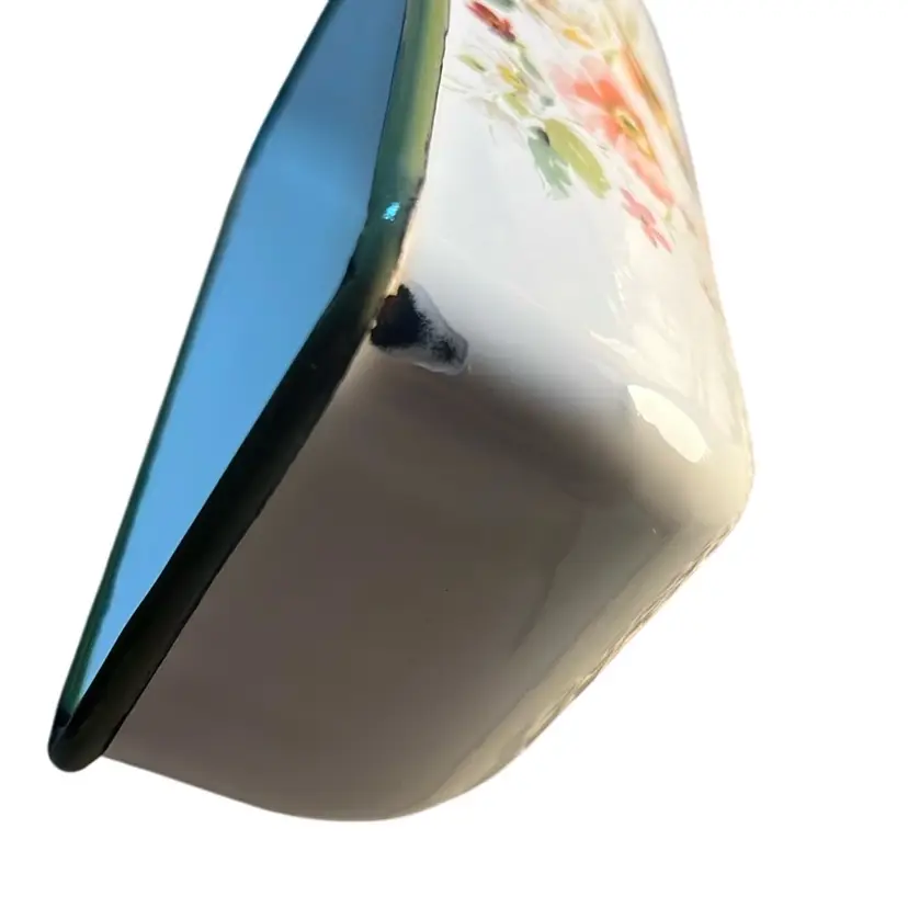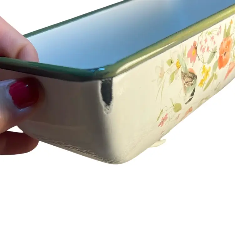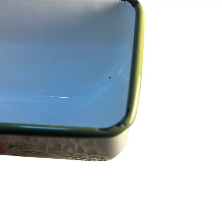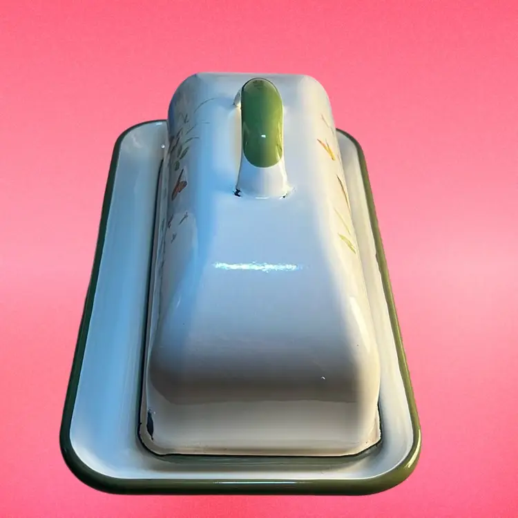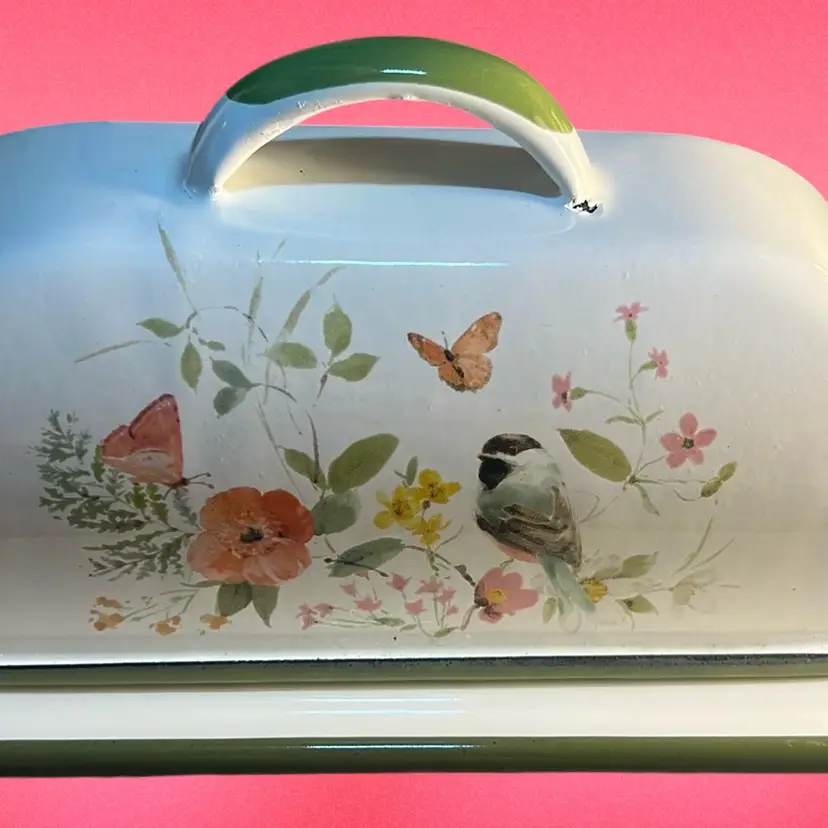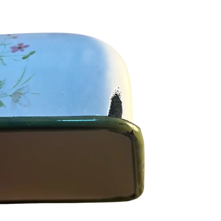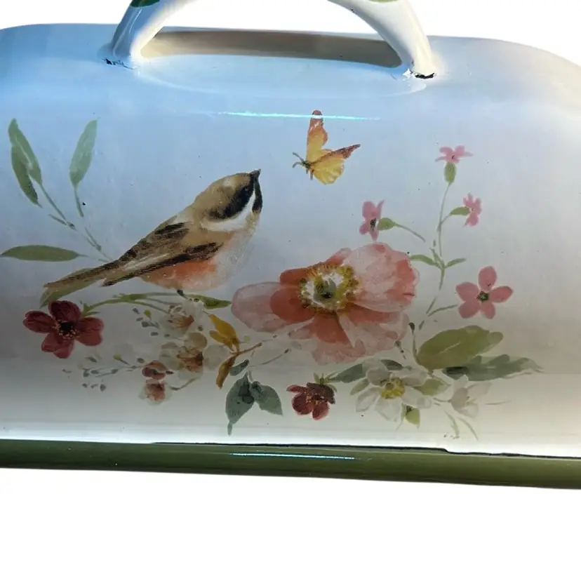 Made of durable metal and painted with enamel. Features flowers,birds and butterfly. Very lovely piece and can hold 2 sticks of butter. Has some scuffing on all 4 edges of the lid * see last 4 pictures. Measures 7.36” x 5.3”