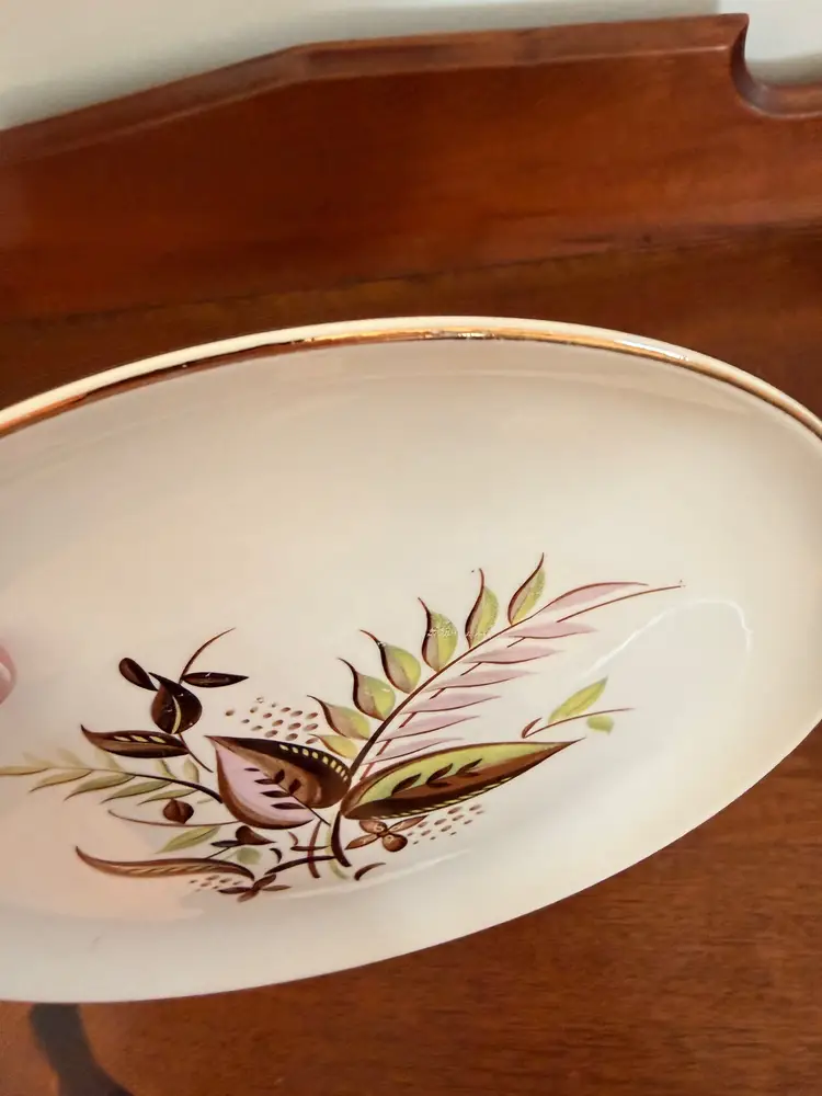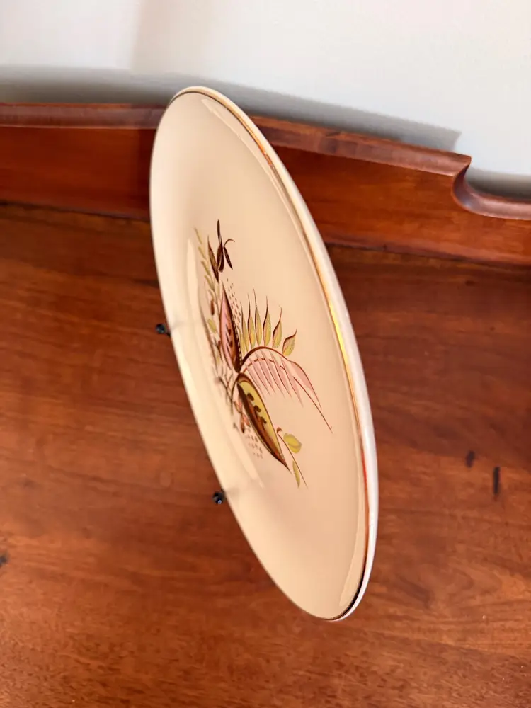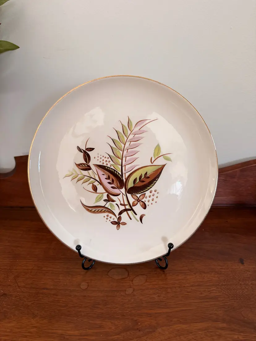Beautiful vintage Taylor, Smith & Taylor (TST) dinner plate in the sought-after TST248 pattern, commonly referred to by collectors as “Jamaica.” This plate features a classic mid-century modern botanical design in warm brown, soft pink, and olive green tones on an ivory background with a gold trimmed rim.