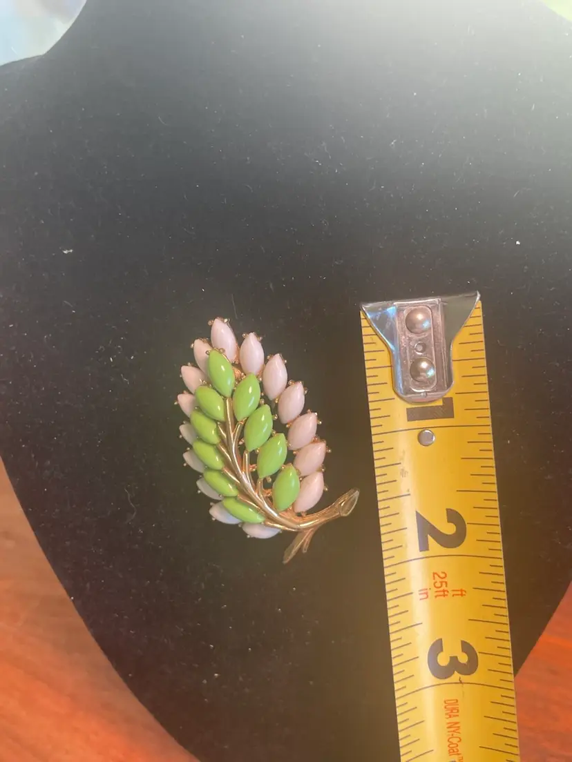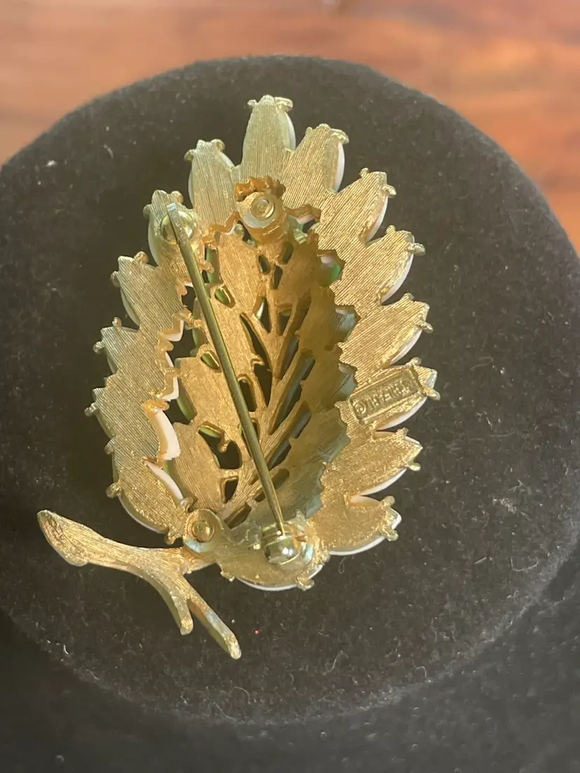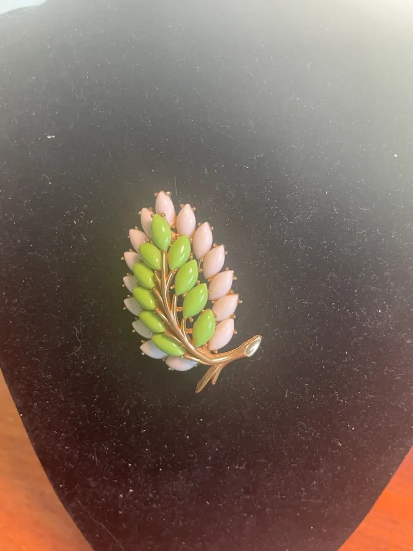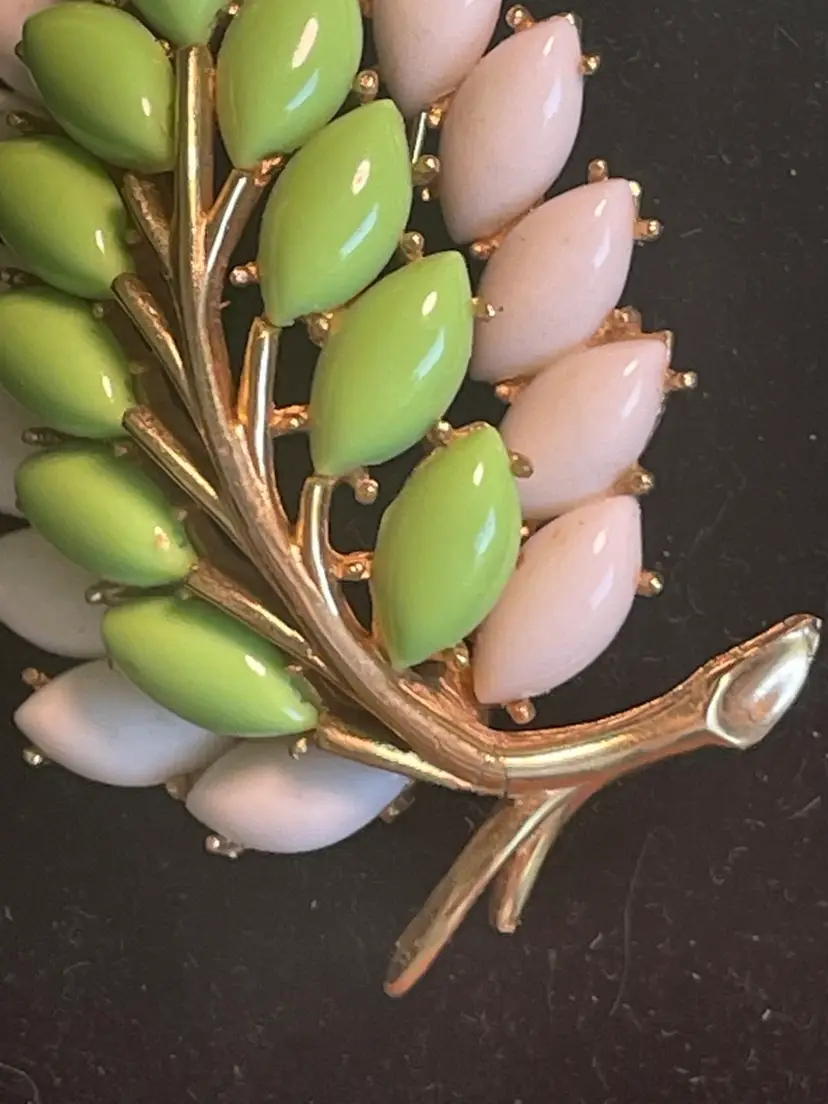 This item is a Trifari vintage leaf and berry brooch featuring green, pink, and white "berries" (likely glass or lucite navette stones) set on a gold-tone branch. This style of figural costume jewelry was popular in the mid-20th century, often associated with designers like Trifari and Napier, who created similar "milk glass" leaf and berry collections.