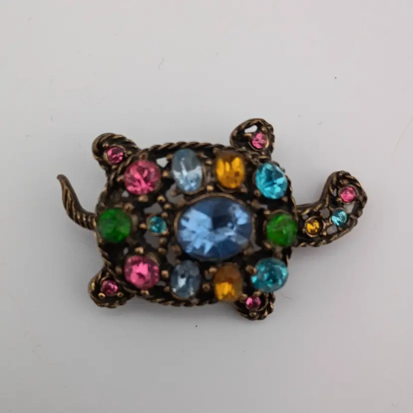 It's a sweet turtle brooch with multicolor rhinestones. I think it's vintage and it's in excellent condition.