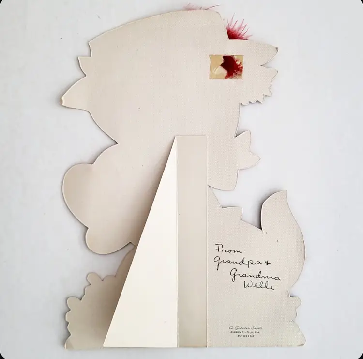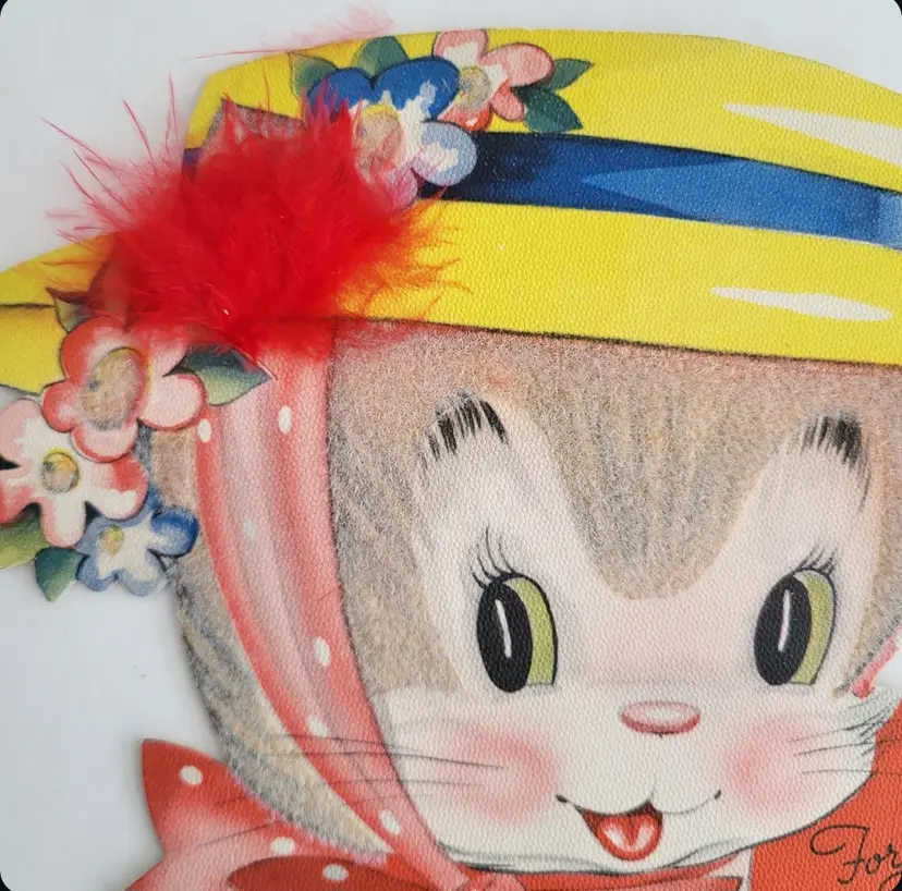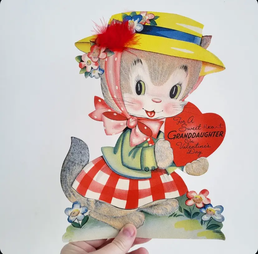Vintage Oversized Flocked Cat Valentine card. Easel back can stand on its own. Writing on back/used. Measures 10 in tall x 7 in wide.