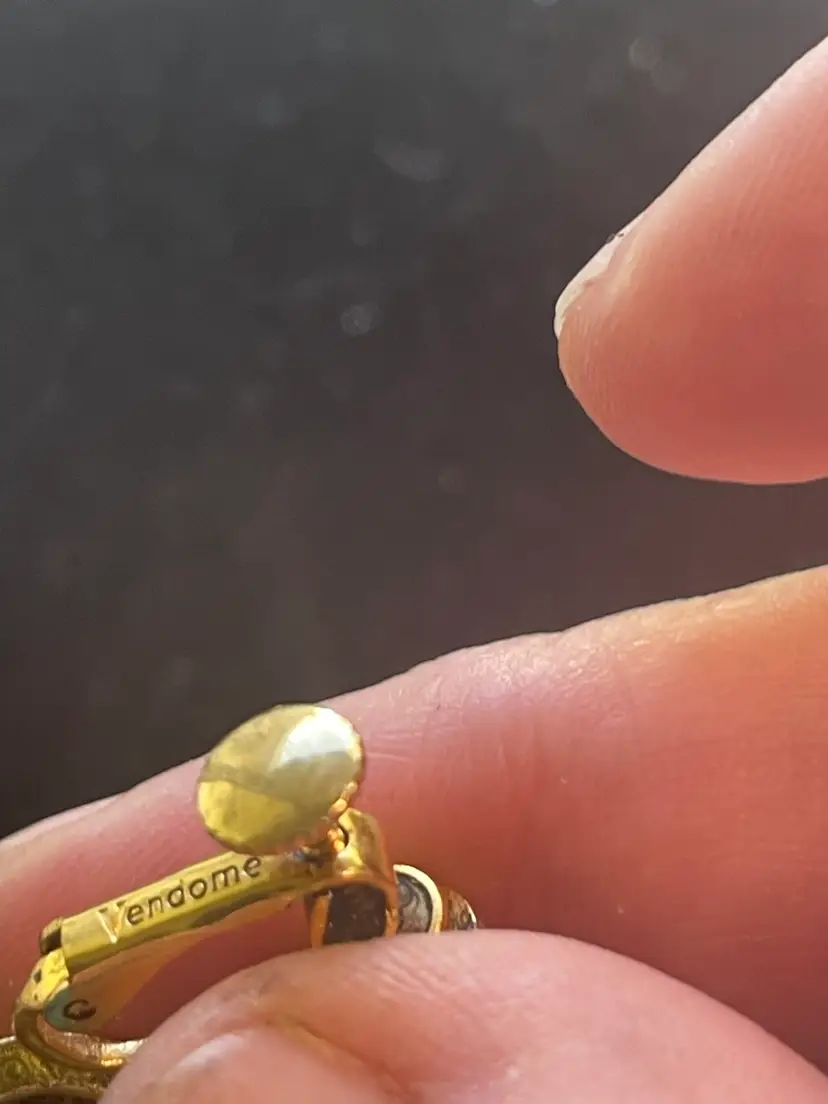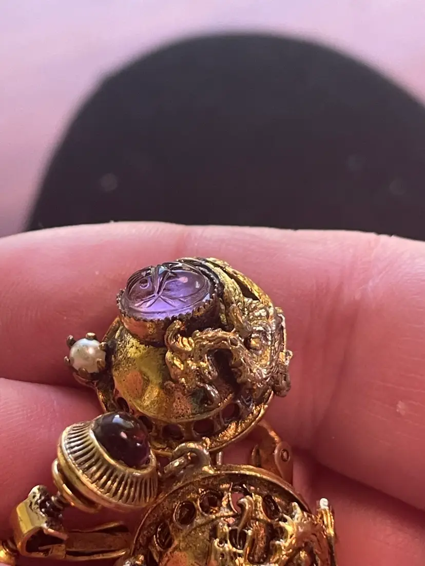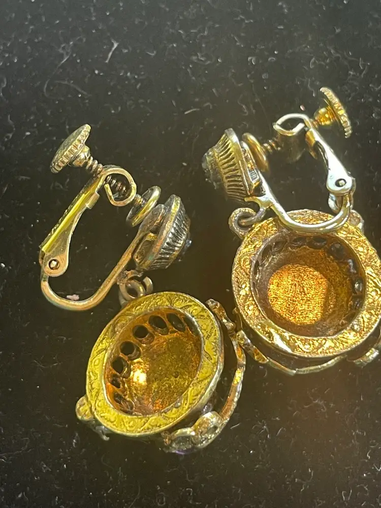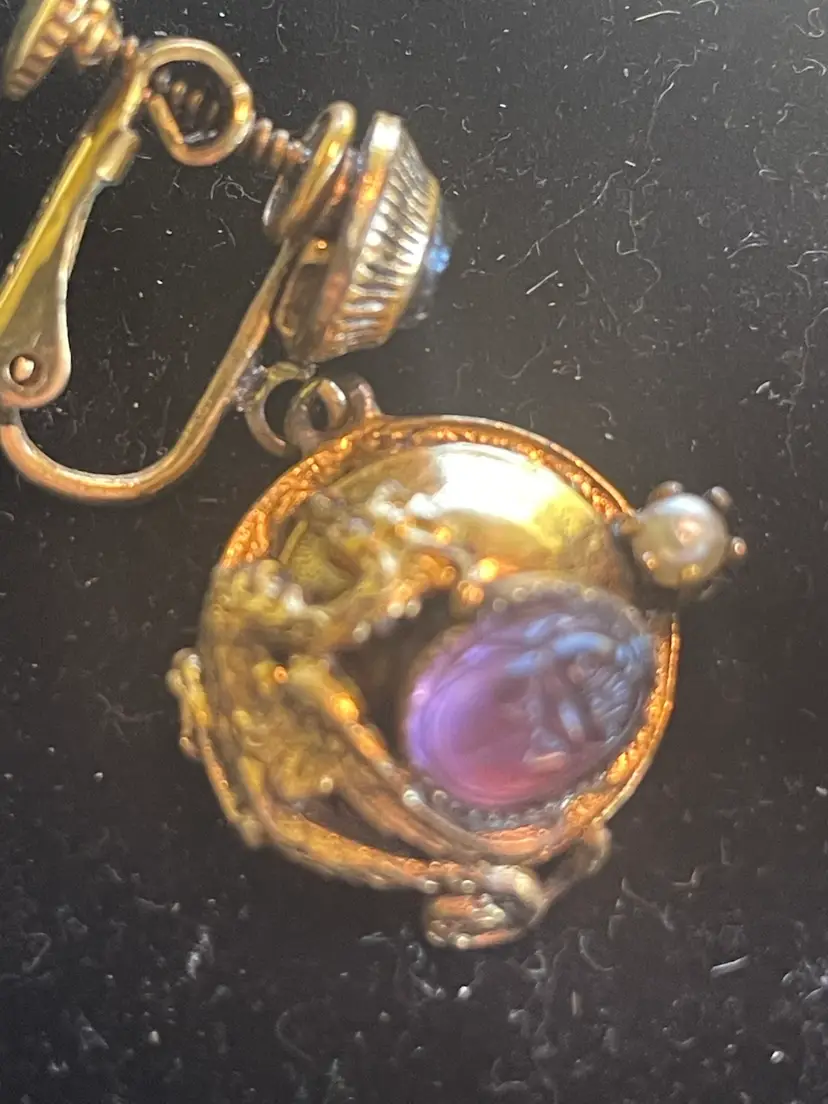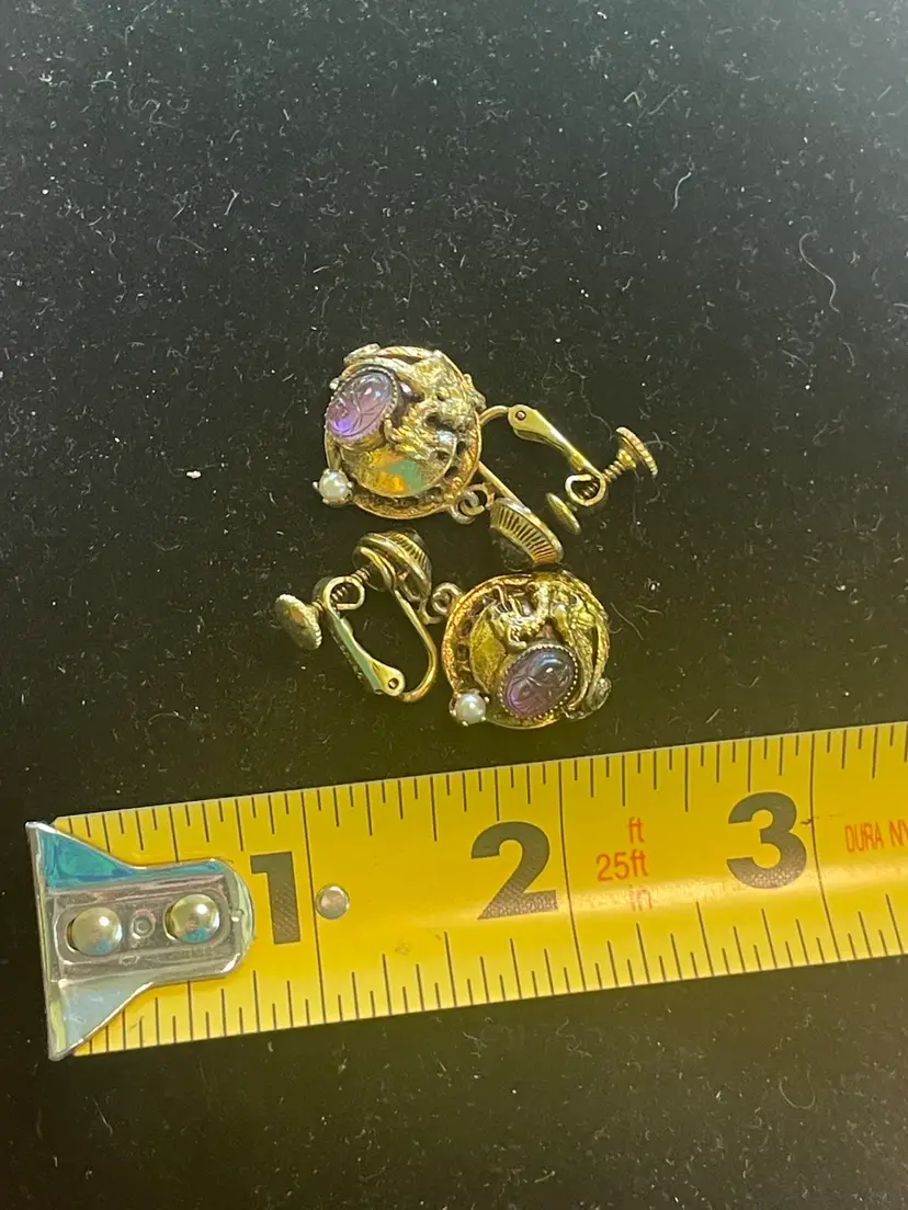 These Vendome earrings are aVictorian-style screw-back earrings, featuring carved purple glass scarabs and small pearls. The design suggests an Etruscan Revival influence with intricate gold-toned metalwork. Vendome was the high-end costume jewelry line of the US-based manufacturing company Coro, active from 1944 to 1979