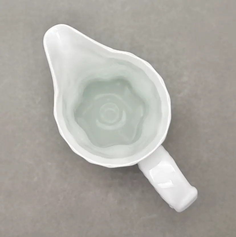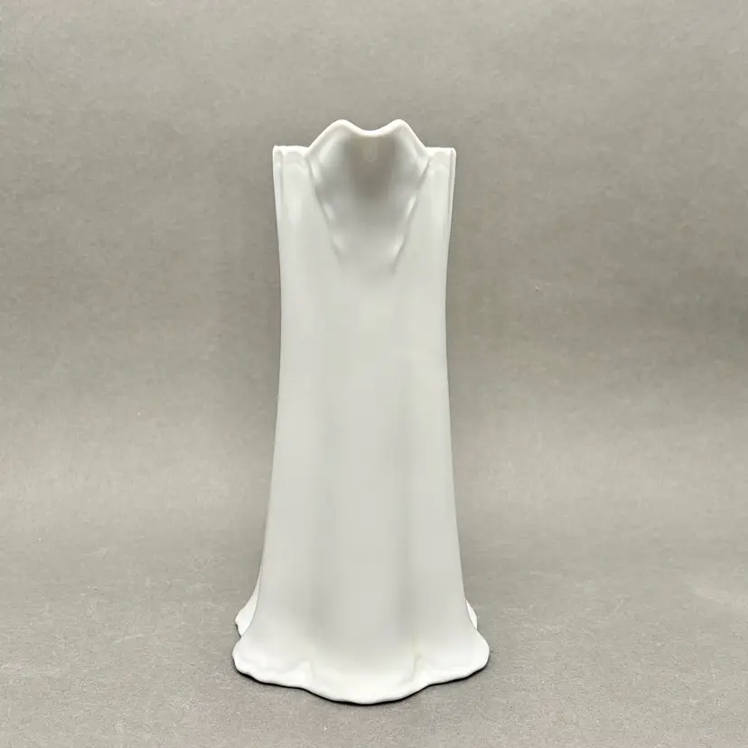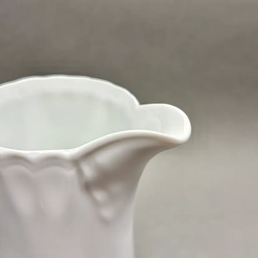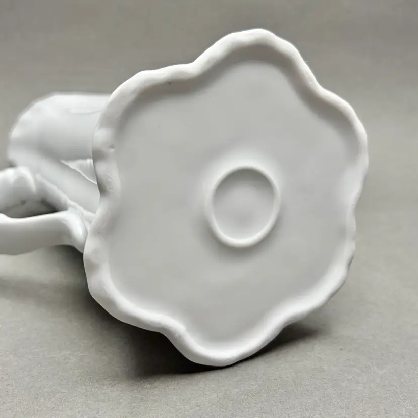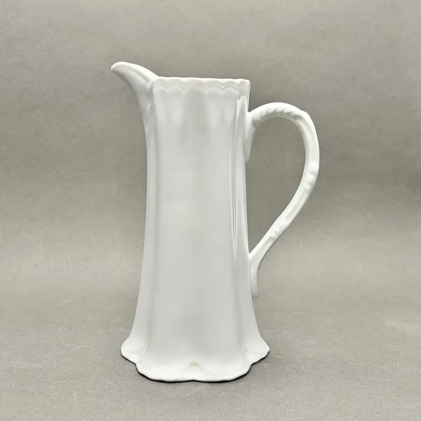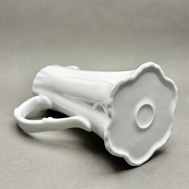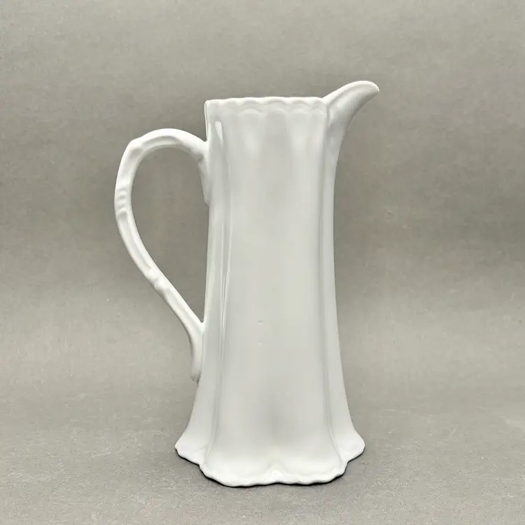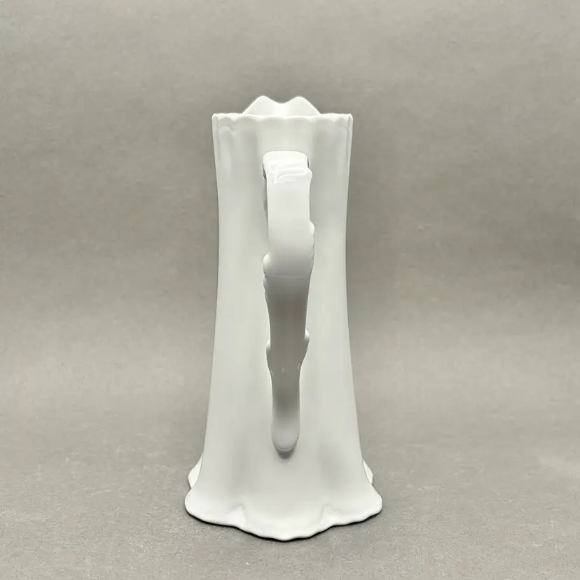 • This elegant white porcelain pitcher features a tall, fluted body with a gracefully scalloped rim and a unique flower-shaped pedestal base. • Its ornate, curved handle adds a touch of Victorian-inspired charm, making it a perfect statement piece for a Mid-Century Modern or cottagecore aesthetic. • Measurements: 8 1/4” tall, 4” body diameter, and 5 1/2” from handle to spout. • It is in very good vintage condition with no visible chips, cracks or scratches.