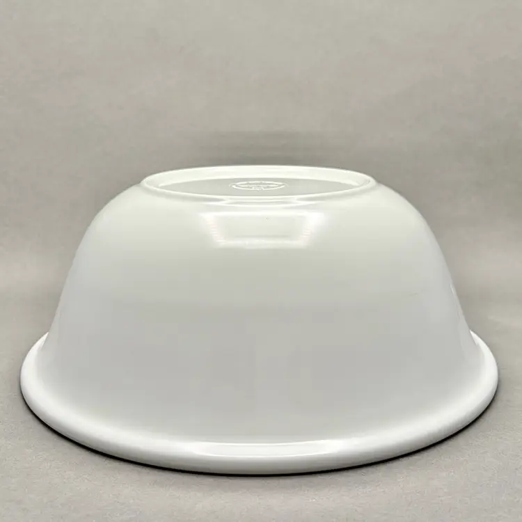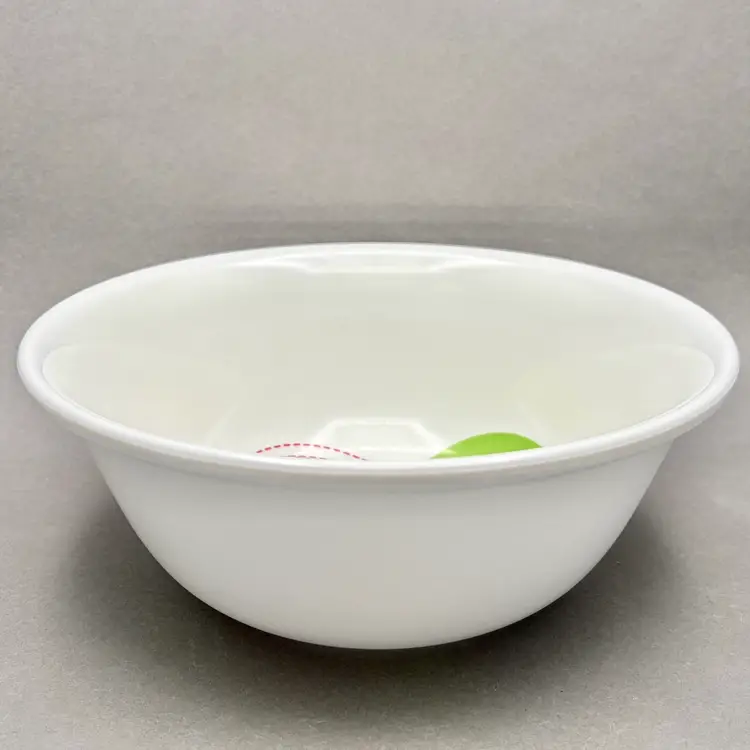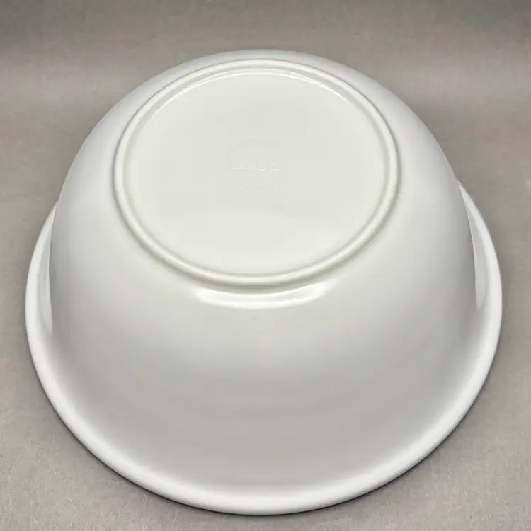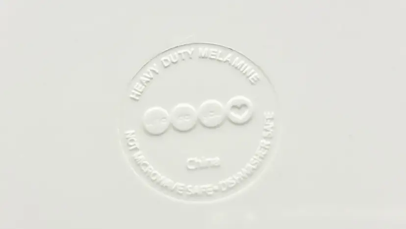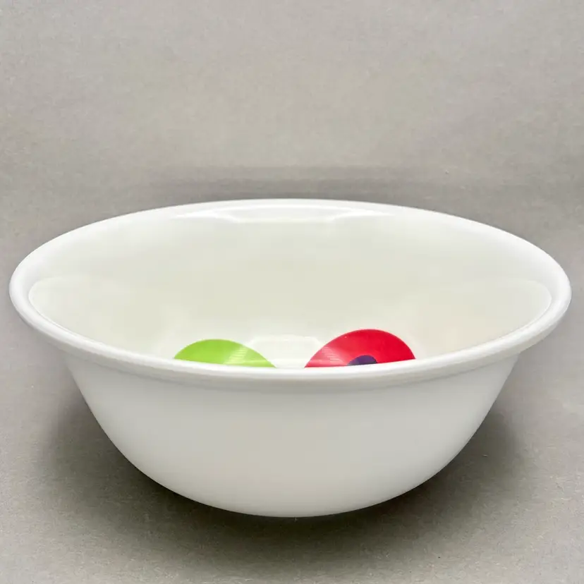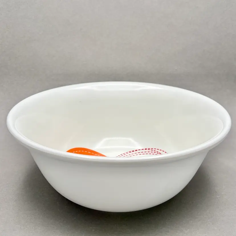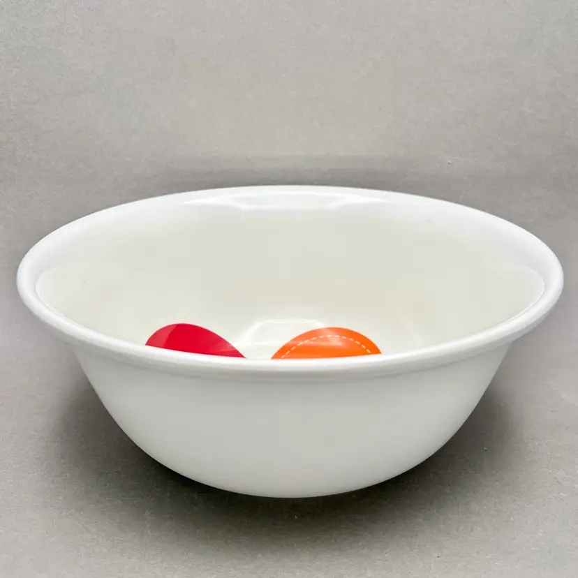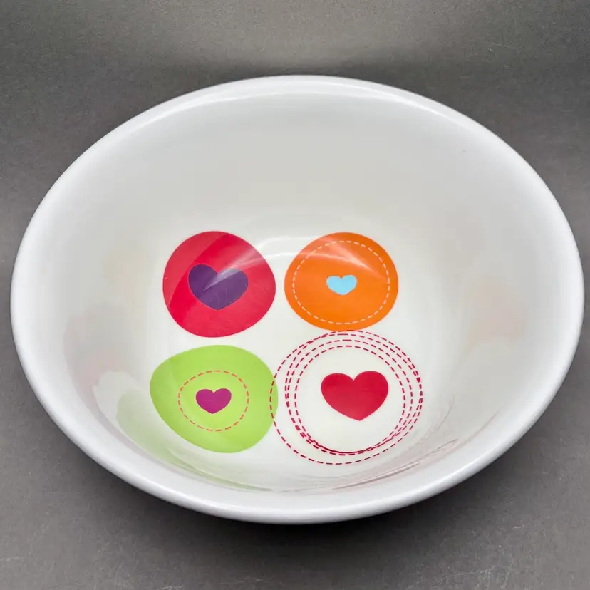 • This heavy-duty melamine serving bowl features a bright, clean white background with four distinct, colorful heart designs in the center. It is a substantial, durable piece perfect for serving salads, popcorn, or as a cheerful fruit bowl.
