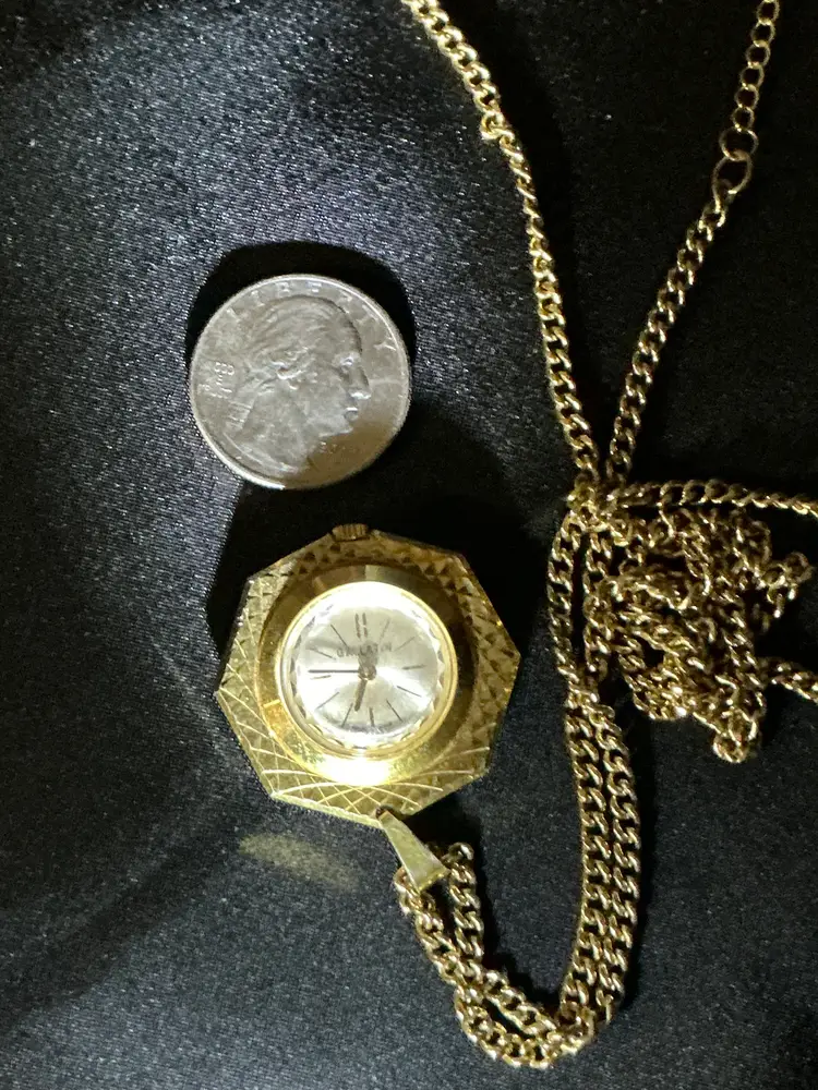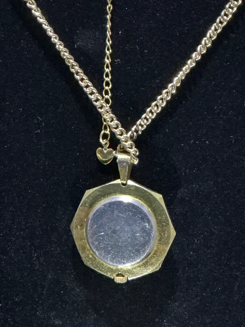 VINTAGE WIND-UP WATCH NECKLACE. 34" GOLDTONE CHAIN. MANUAL WIND – CURRENTLY RUNNING AND KEEPING TIME.