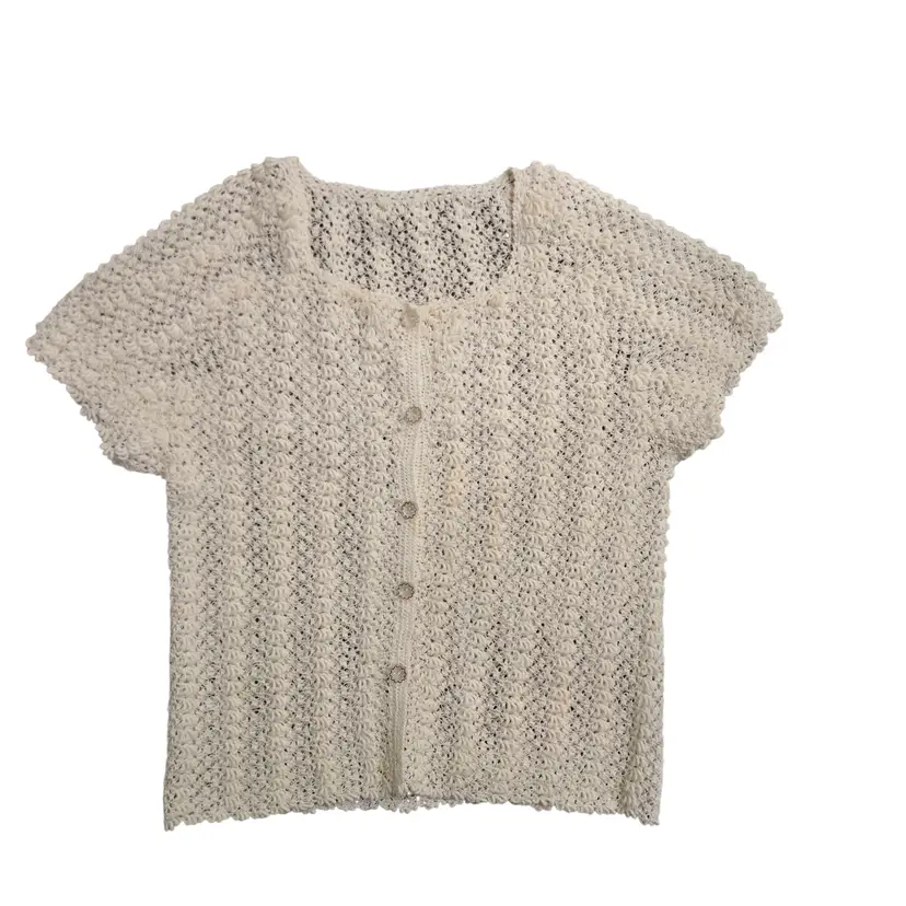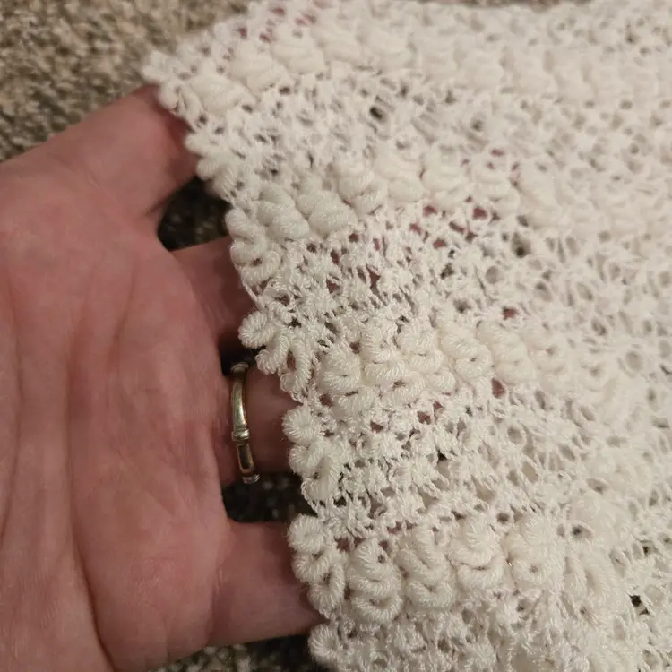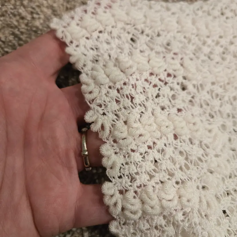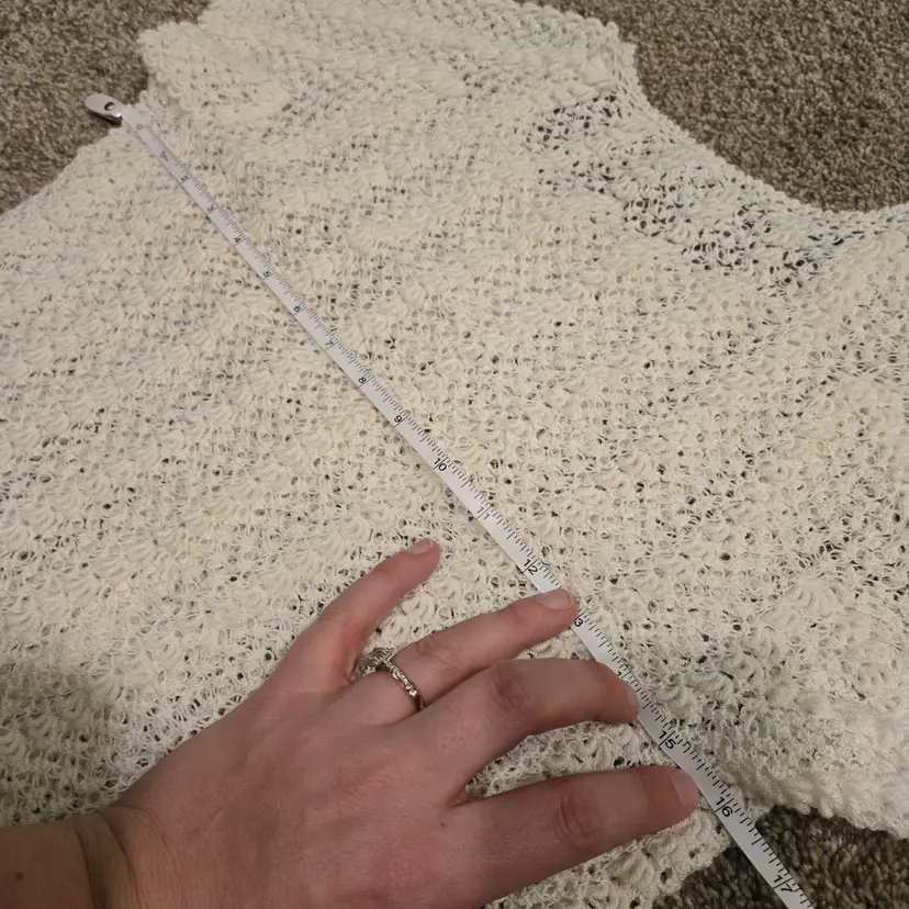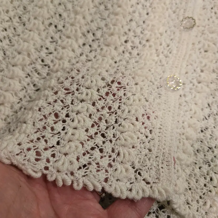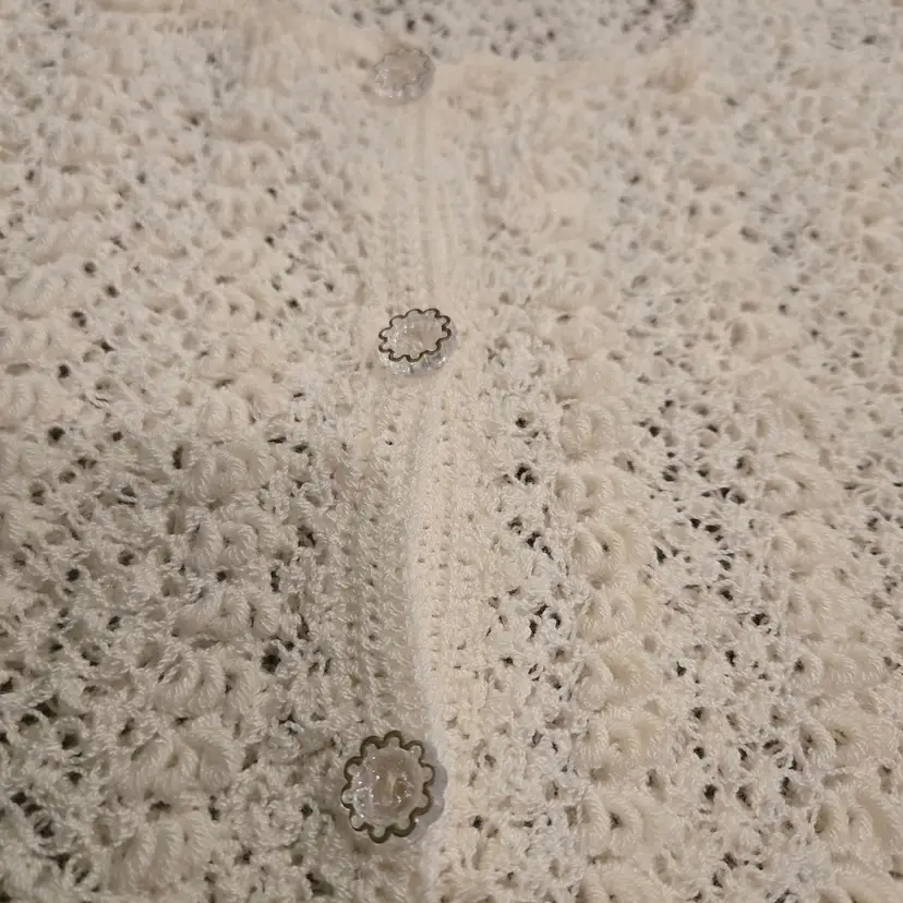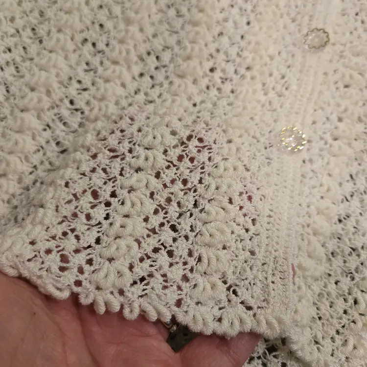 Slightly cropped. Vintage buttons. Most likely a cotton yarn. Has some stretch to it. In excellent condition. Very little signs of wear from use. Please see pictures for more details.