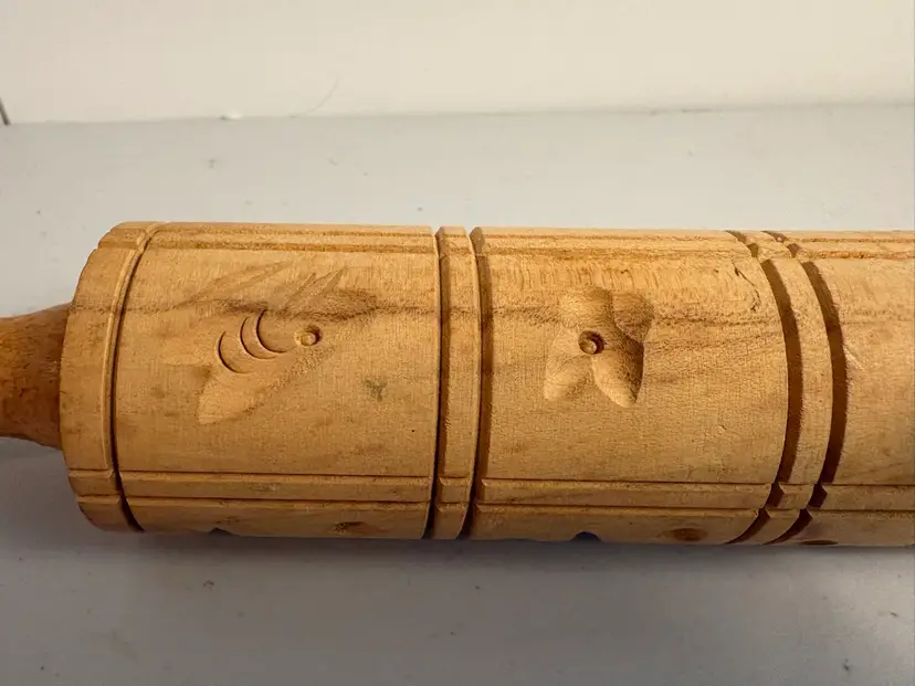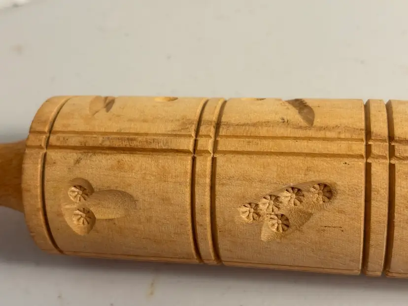 This vintage wood Springerle rolling pin is a handmade collectible from Germany, featuring a unique 16 design shortbread cookie. The rolling pin has a medium size with a brown color and a variety of embossed images, making it a charming addition to any kitchen or home decor. With its German origins and vintage appeal, this embossing rolling pin is sure to be a treasured item for any baking enthusiast or collector of handmade items.