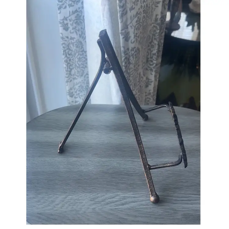 This vintage wrought iron tabletop display easel is adorned with ornate scroll accents, adding a touch of elegance to any home decor. The free-standing design allows for easy placement on a tabletop, and the matte finish complements the intricate wrought iron material. With dimensions of 9.5" in height and 8" in width, this display easel is perfect for showcasing plates, artwork, cookbooks, or other items in a stylish and decorative manner. It is a versatile piece that can enhance any room's aesthetic with its classic and timeless design.