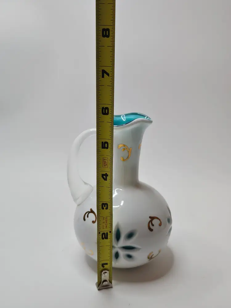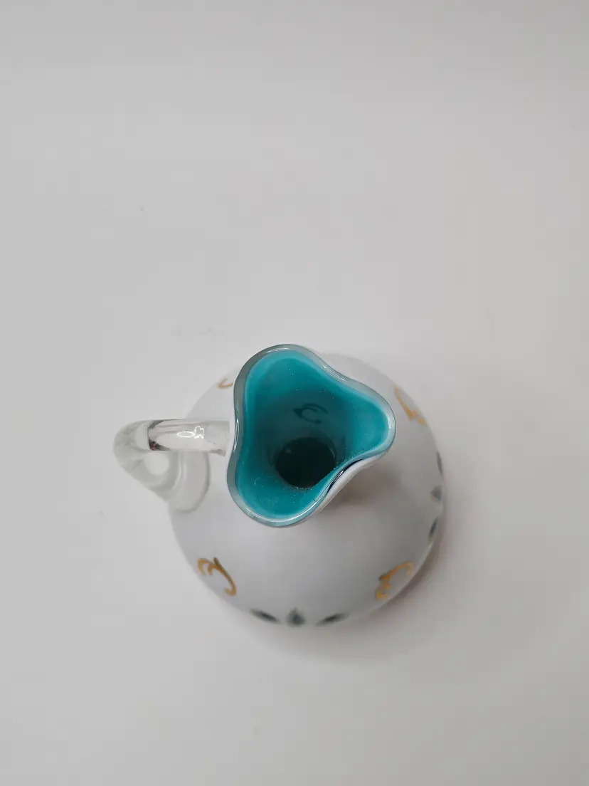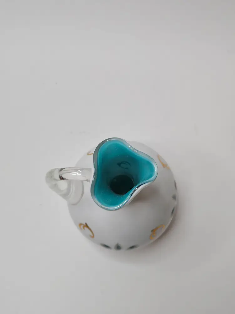 This vintage Bohemian Czech glass cruet features a unique white cut to blue pattern with an applied clear handle, giving it a distinctive and eye-catching design. Made of hand-blown glass with a glossy finish, this cruet exudes a sense of artistry and craftsmanship. Perfect for adding a touch of elegance to your dining table, this decorative piece is both functional and stylish, making it a charming addition to your collection of serveware.