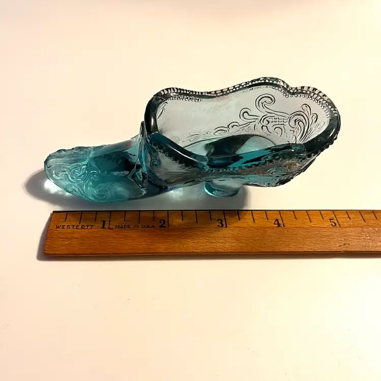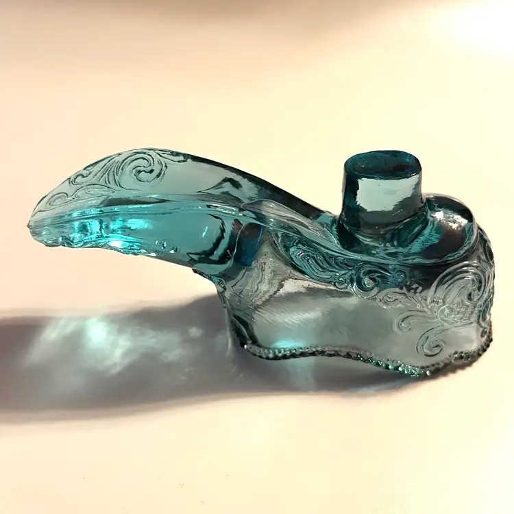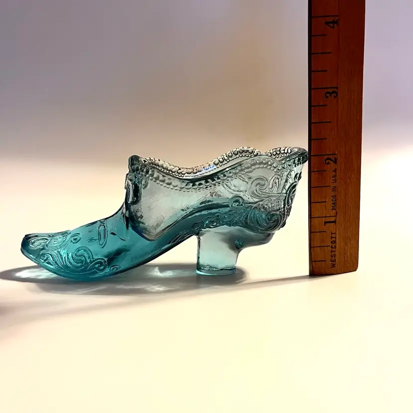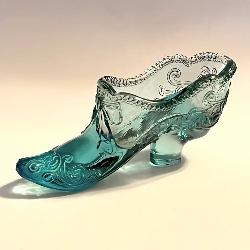 Mosser Glass high‑heel slipper icrafted in the classic Victorian‑inspired design produced by the Mosser Glass Company of Ohio. Made of hand‑pressed molded glass, it features crisp detailing in the swirl/scroll motif, a lovely molded bow tie in front, scalloped edging, and scroll along the sides. The blue color shows beautifully in natural or display lighting, giving the piece a luminous presence.