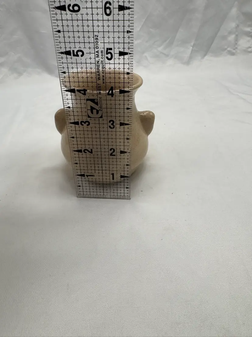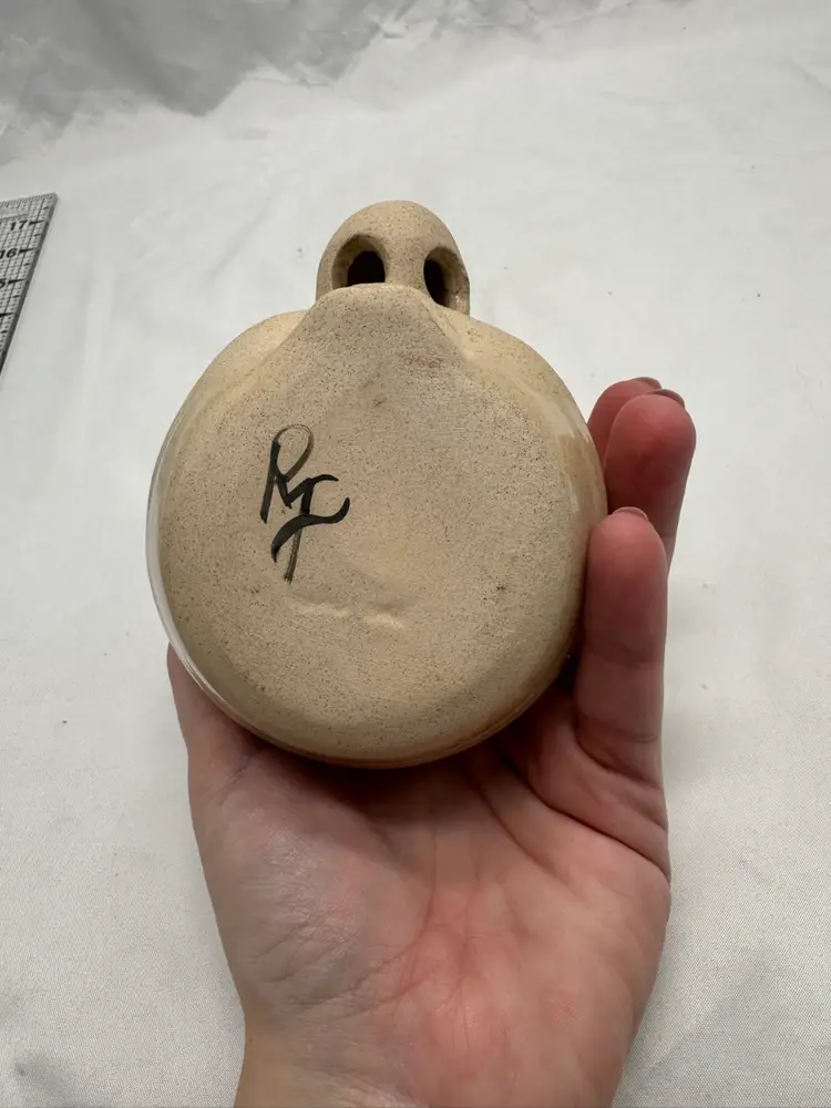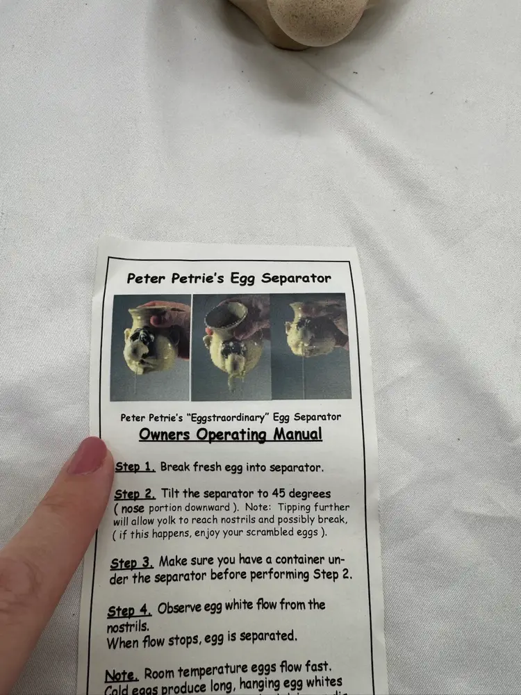 Vintage pottery Peter Petries Egg Separator. This is a unique way to separate your yoke from the white of your egg. It is also super funny and is a great addition to your kitchen hardware. New condition. No chips, no cracks. See pictures for measurements.