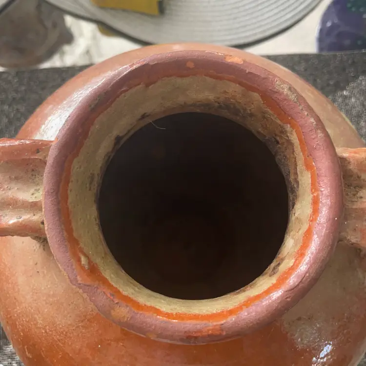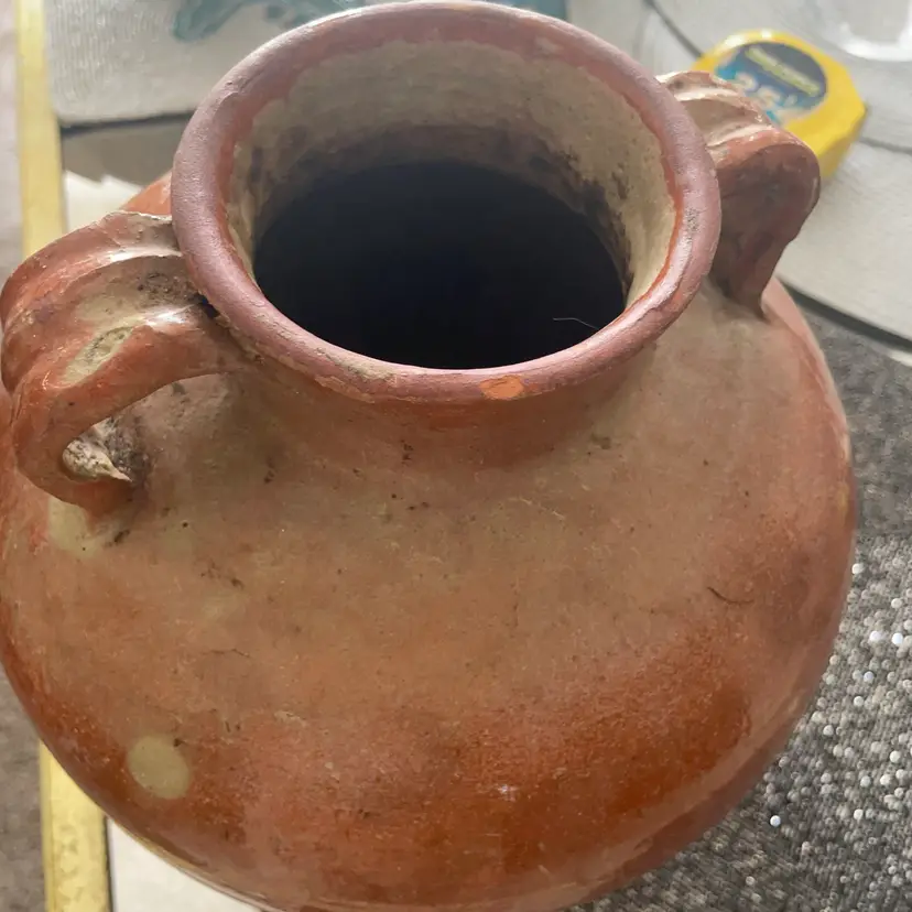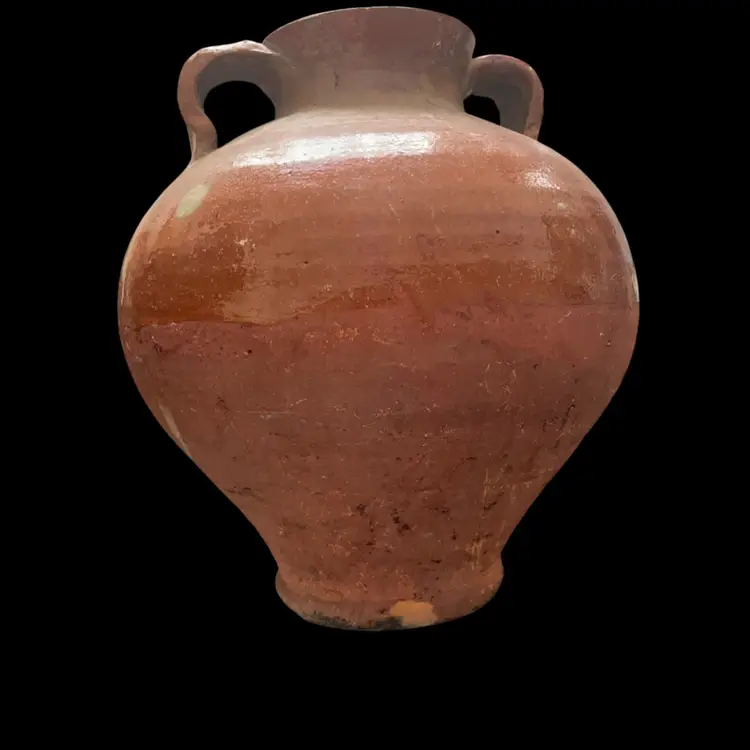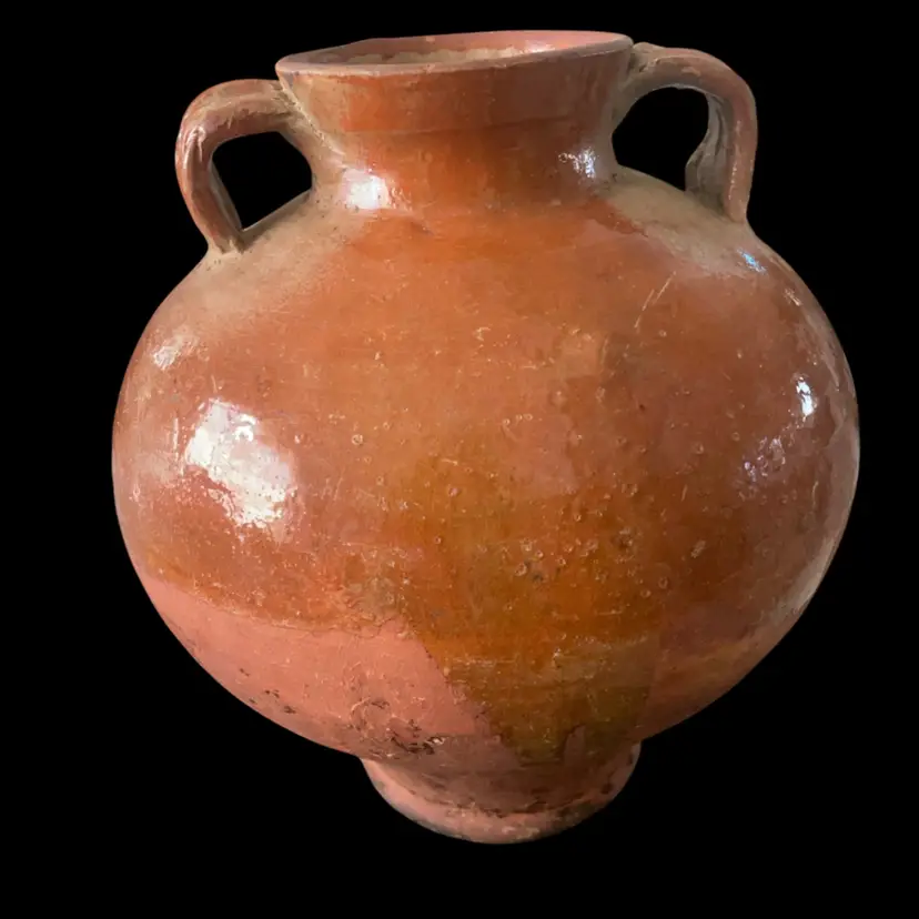 11” tall and 8” wide. This is an antique French or Spanish glazed terracotta oil jar, also known as an olive jar or pitcher. These jars were used to store and transport oil, water, or wine. They were common throughout Southern France until the early 20th century. The glaze and wear marks are a natural patina developed over time, enhancing its rustic appearance. Similar items can date from the late 19th or early 20th century. Note: bottom lip is chipped however this is considered by most collectors as mark of authenticity