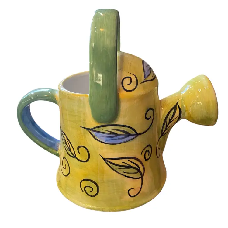 Watering Can Planter Frog Motif Ceramic Green Yellow & Blue Garden Nature Decor 7.5in tall 8in wide