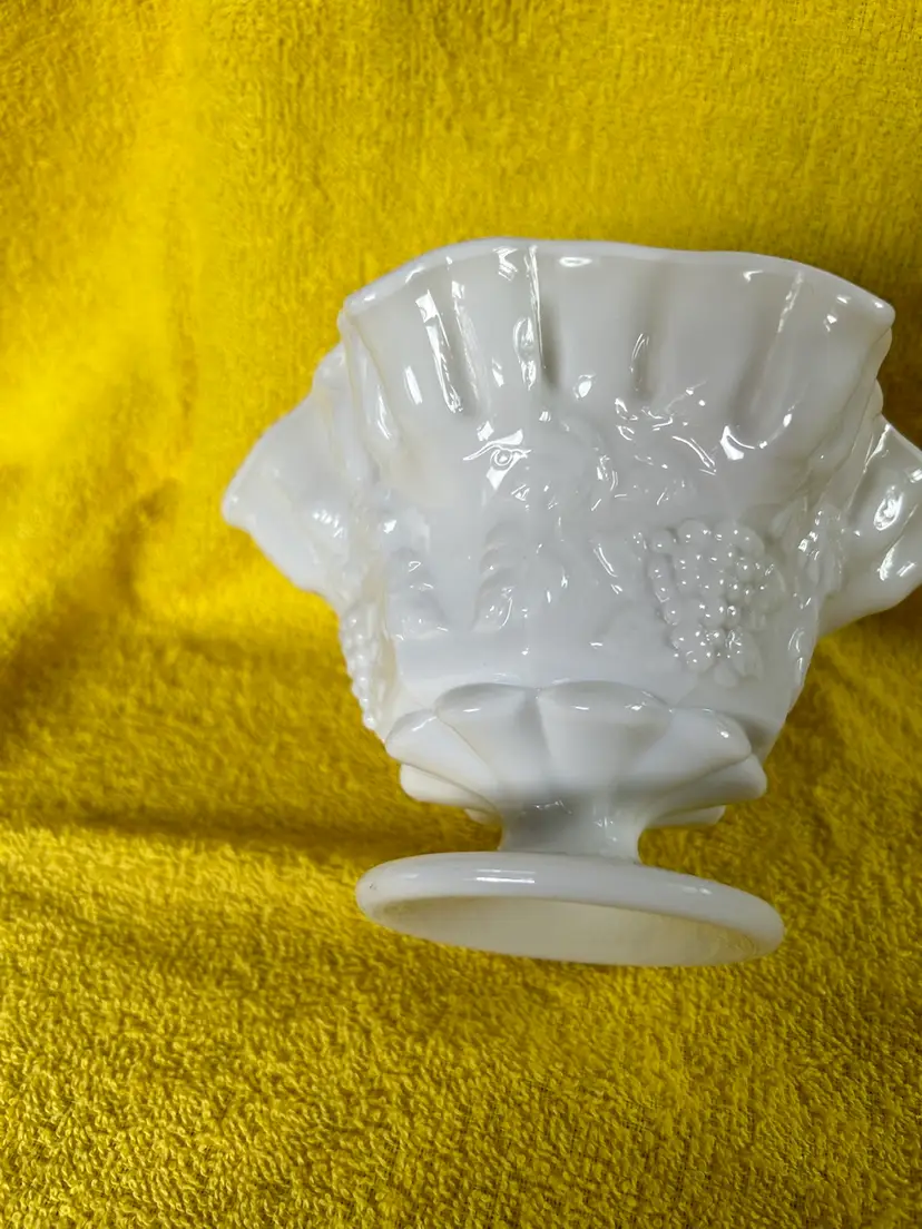 Marked on bottom of pedestal. Grape and panel design.Bowl is approximately 6'' in diameter at the widest part of the ruffle. Excellent condition.