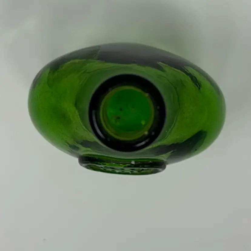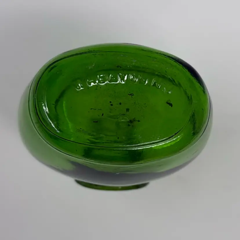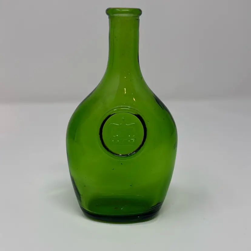 This is a vintage Wheaton New Jersey green glass bottle with an embossed crown design. It is a reproduction piece created by the Wheaton Glass Company, which produced decorative bottles from 1967 to 1975. 5.5 “ x 3” x 2”