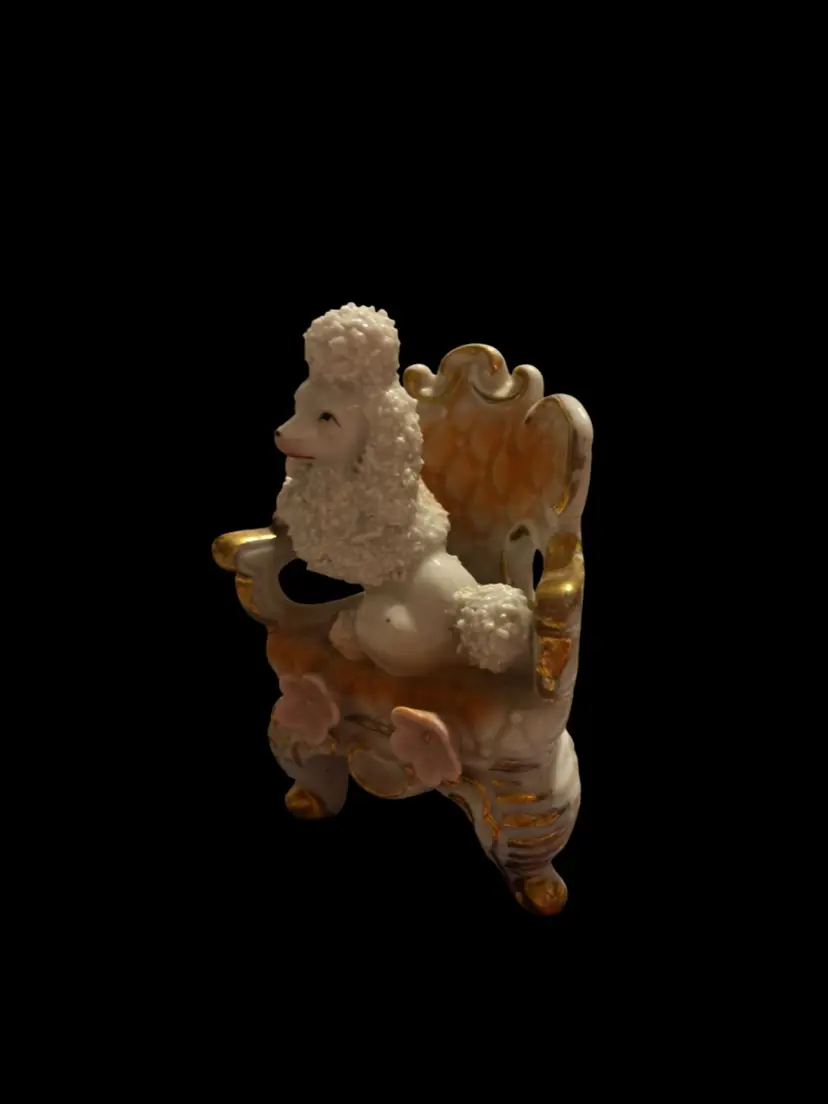 Antique Poodle In Chair Figurine Porcelain Red Letter Japan 3 1/4” x 2 3/4” x 2”.