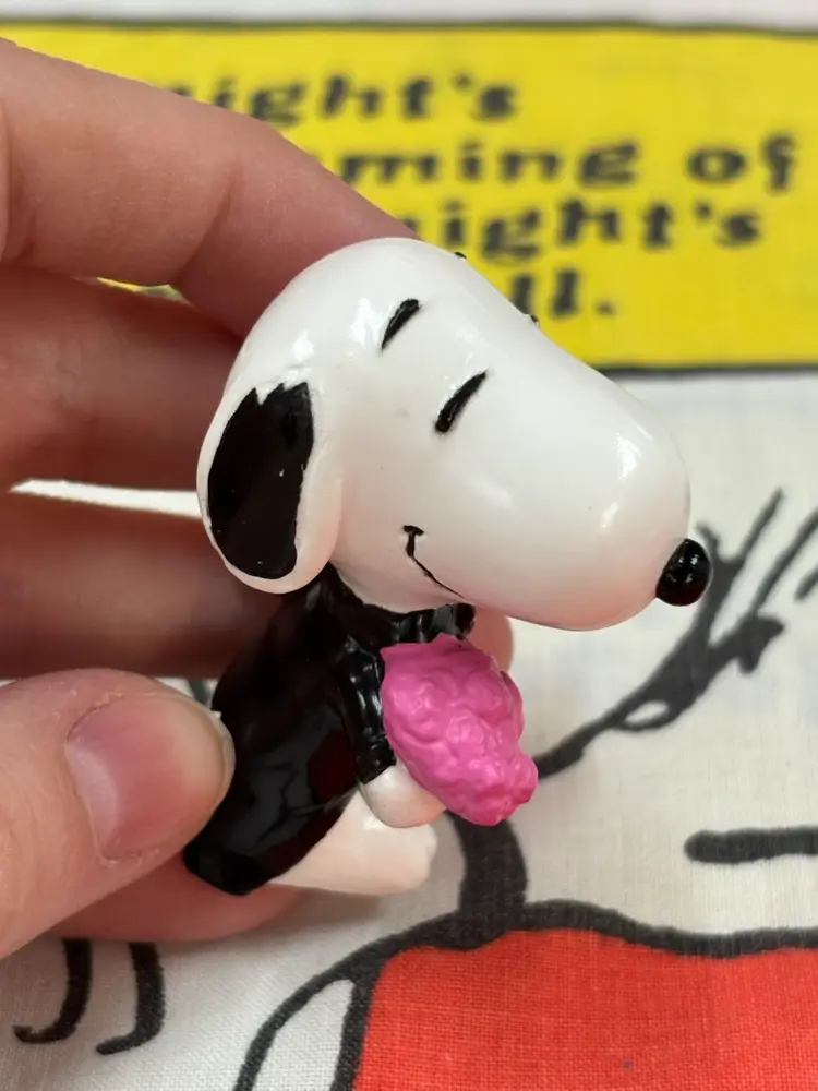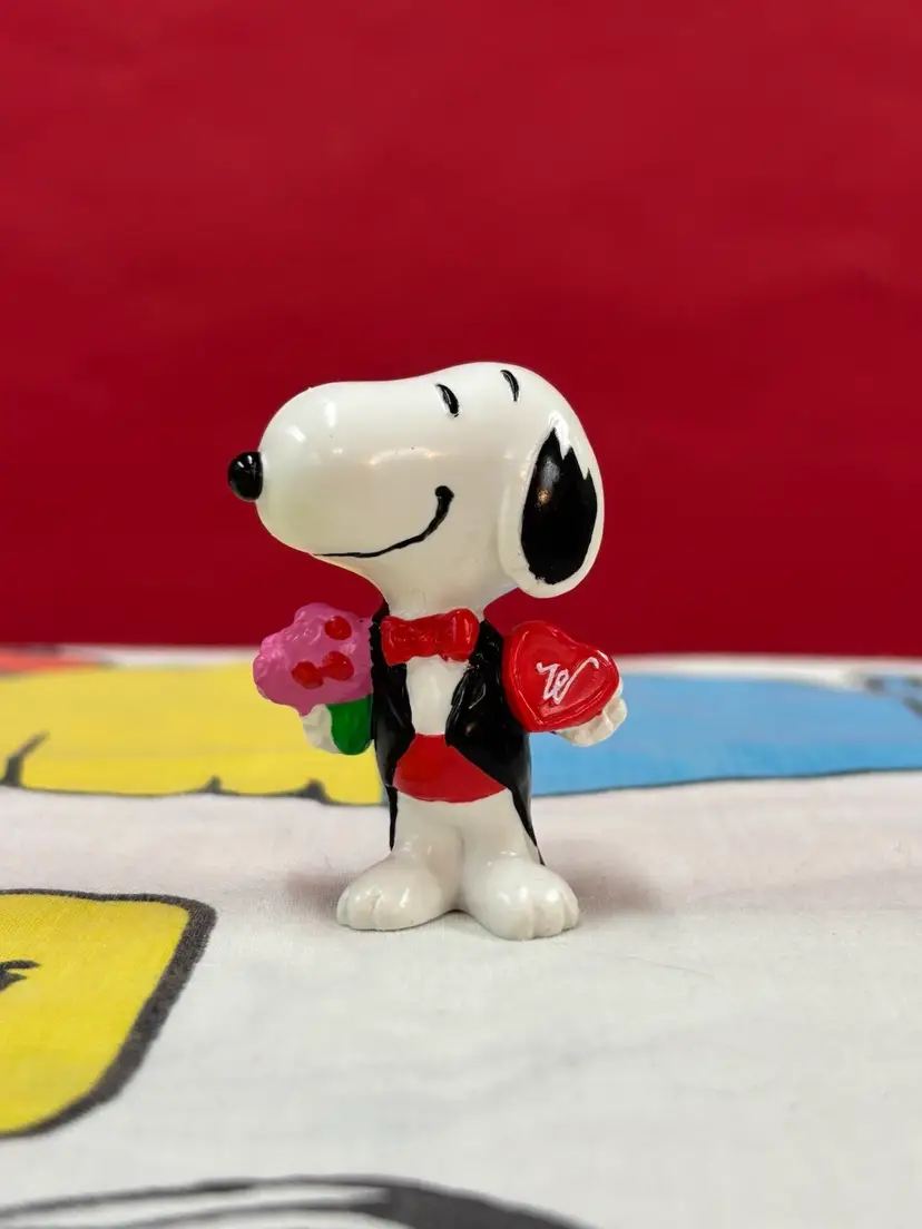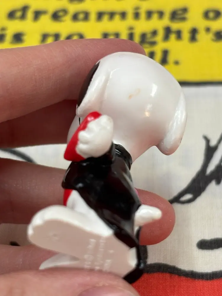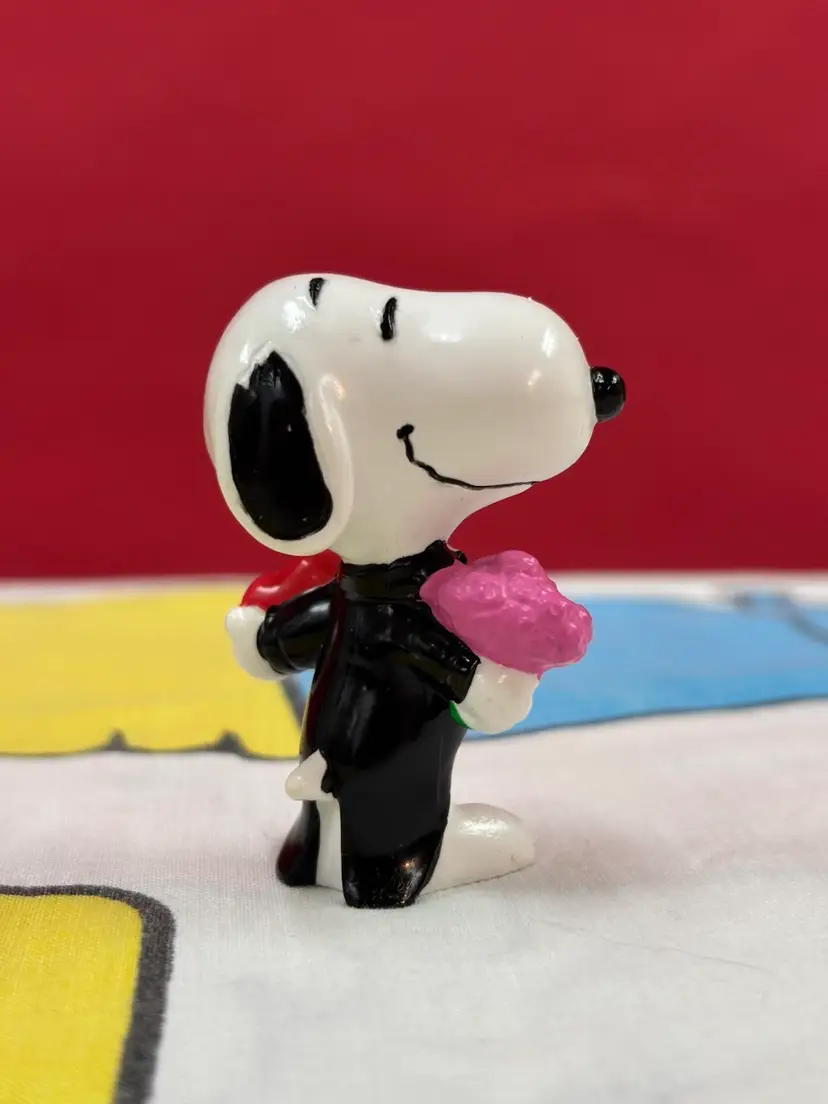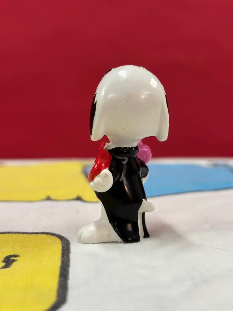 This dapper PVC Snoopy is dressed in a tux and carrying flowers and candy for his sweetheart. He is in typical PVC condition, but I did notice a mark on the back of his head and another one above his eyebrow as seen in the last two pics. He is still in very good condition and would be a great addition to any collection.