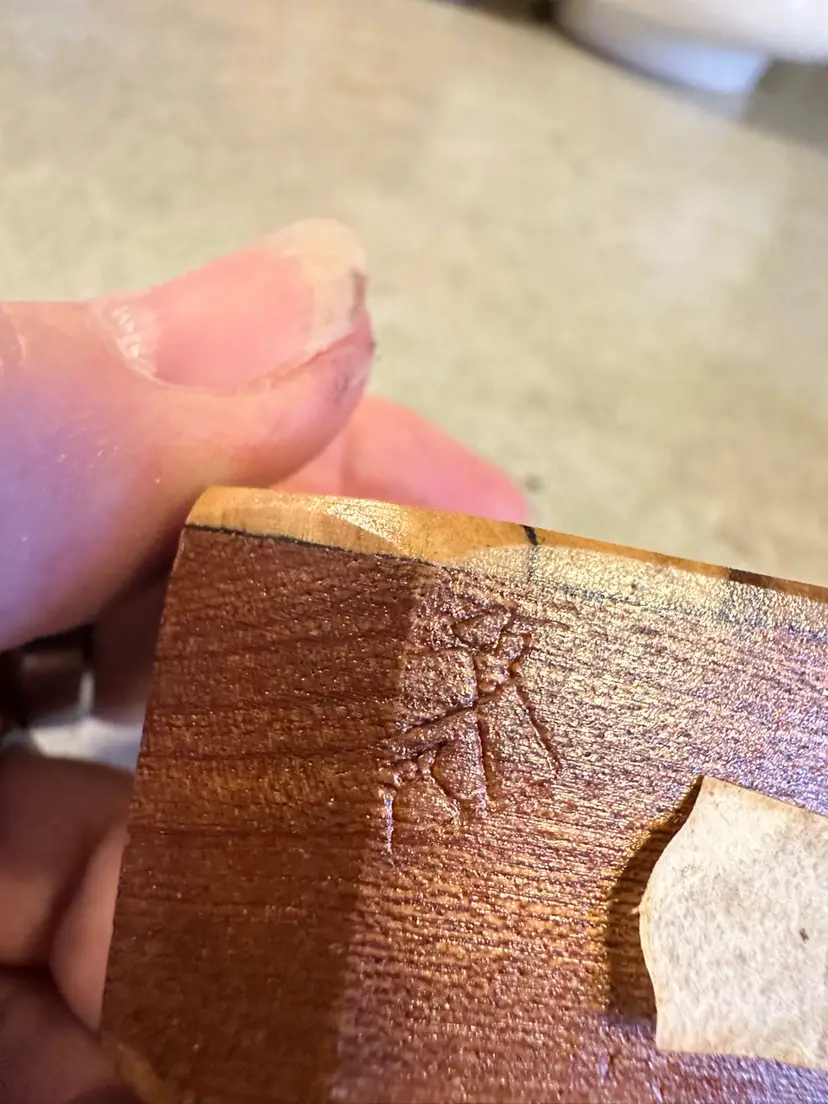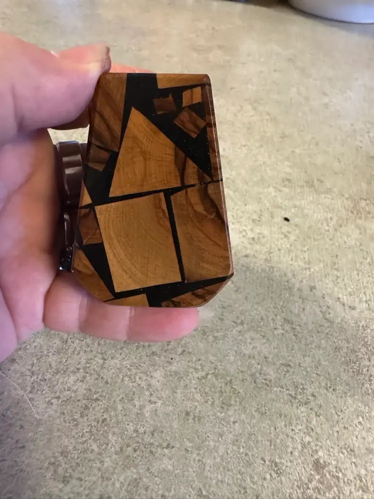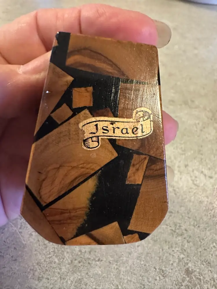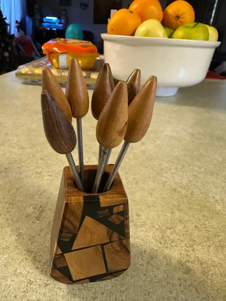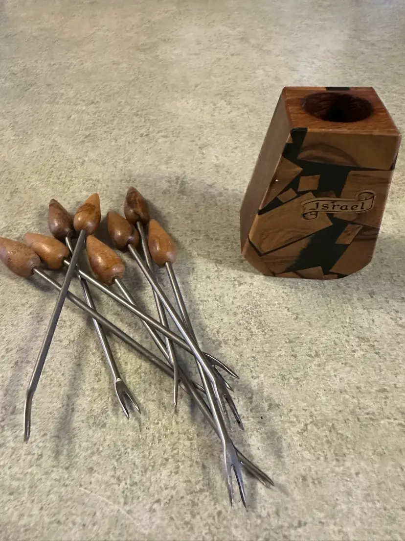 These olive wood appetizer picks with a wooden holder were crafted in Israel, likely dating from the mid-20th century (1950s-1970s). The set features teardrop-shaped wooden tips mounted on metal stems, held in a decorative wooden base with inlay work and marked with "Israel"
