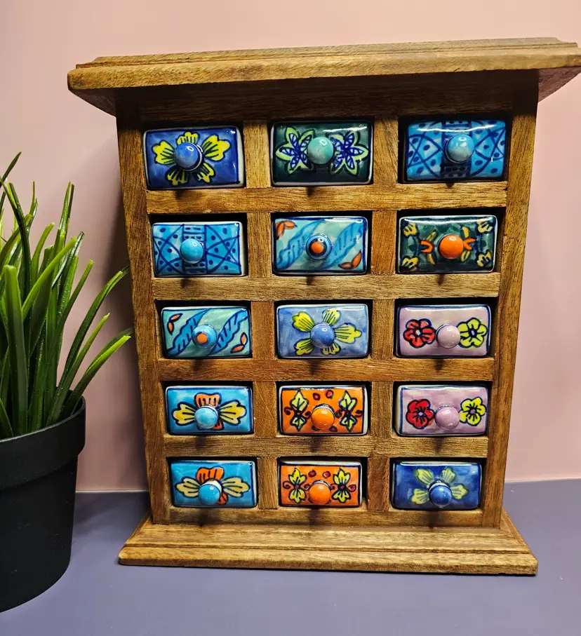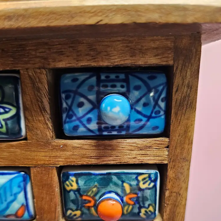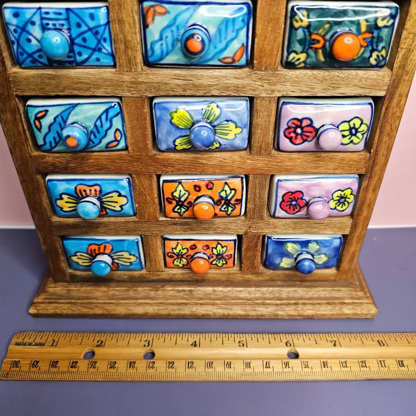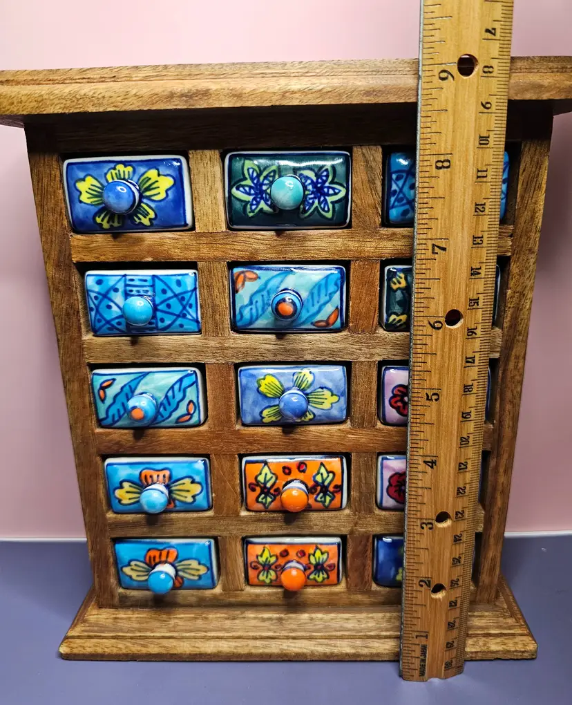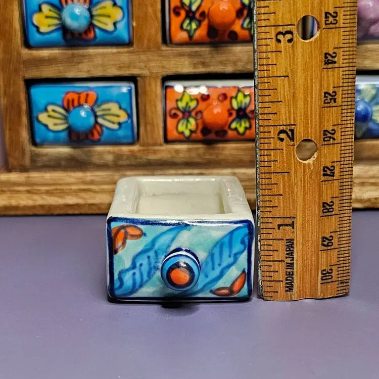 -Pre-owned, used condition. -Light wear on the backside and along the edges. -No chips or cracks to any of the ceramic drawers. -15 total hand painted ceramic drawers. -One drawer pull has a missed paint spot but is glazed. Shown in the last photo. -Each drawer has a metal stopper to prevent them from falling out. -The drawers can be removed by taking a long, thin tool to push the metal stopper back, then pulling the drawer out. -Each drawer measures about 1-3/4 inches wide x 2-1/4" deep x 1" tall. -The overall measurement for the storage is 8" wide x 2.5" deep x 9" tall. -Weighs 4 pounds 6.8 ounces. -Made in India