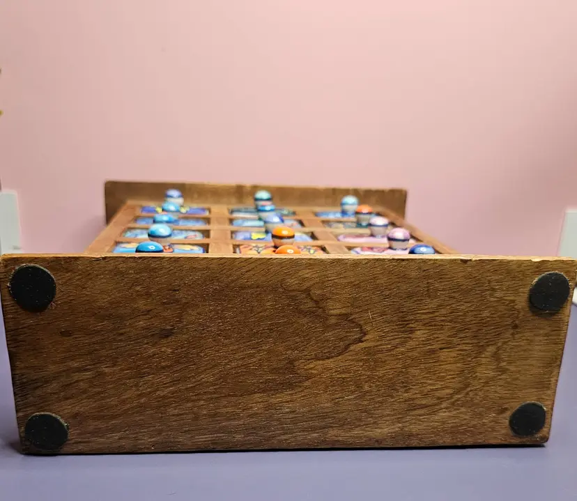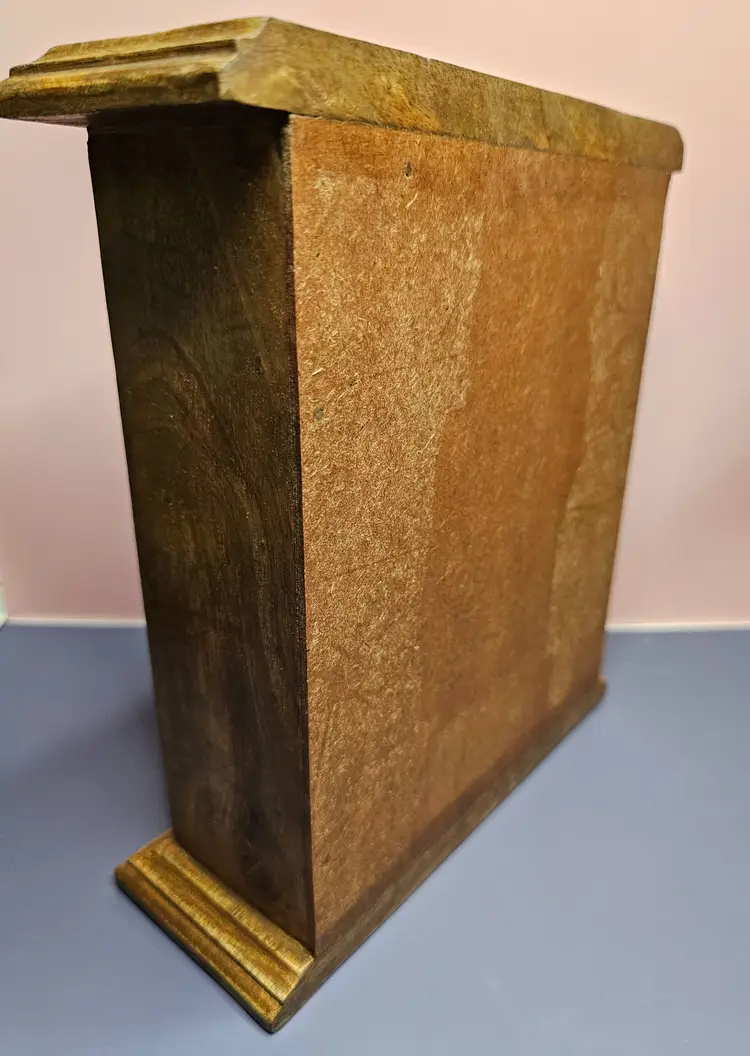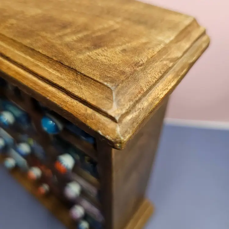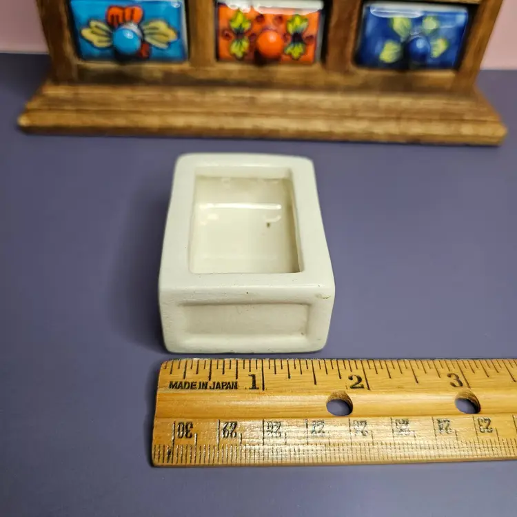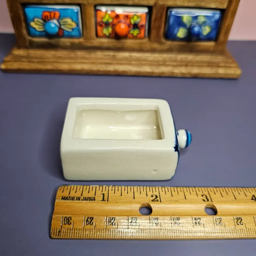 -Pre-owned, used condition. -Light wear on the backside and along the edges. -No chips or cracks to any of the ceramic drawers. -15 total hand painted ceramic drawers. -One drawer pull has a missed paint spot but is glazed. Shown in the last photo. -Each drawer has a metal stopper to prevent them from falling out. -The drawers can be removed by taking a long, thin tool to push the metal stopper back, then pulling the drawer out. -Each drawer measures about 1-3/4 inches wide x 2-1/4" deep x 1" tall. -The overall measurement for the storage is 8" wide x 2.5" deep x 9" tall. -Weighs 4 pounds 6.8 ounces. -Made in India