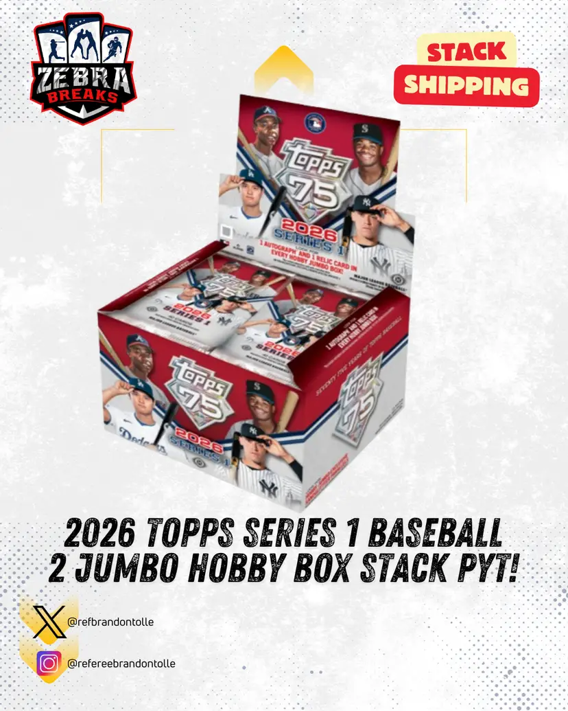 2 Jumbo Hobby Boxes of 2026 Topps Series 1 Baseball! STACK SHIPPING APPLIES All cards stack, you can request shipping by purchasing the "Stack Shipping Request" Item in the marketplace for Zebra Breaks specifically. Stack shipping is a $6 flat fee no matter how large your stack is. Shipping will occur the Sunday/Monday following your request if placed by Thursday night of the week you request shipping.