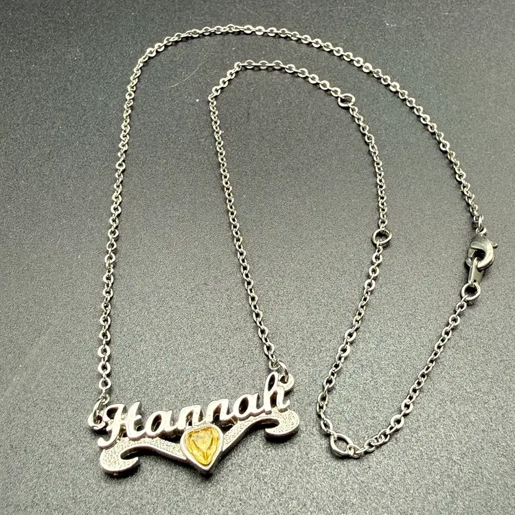 Name Necklace HANNAH Silver Tone Yellow Rhinestone Heart 14-19" Lobster Clasp